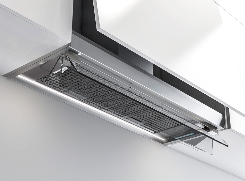 Hota Pando TIM-2, otel inoxidabil - negru cu viziera frontala din sticla cu balamale. Disponibila in latimi frontale de 60, 80, 90 si 120 cm.