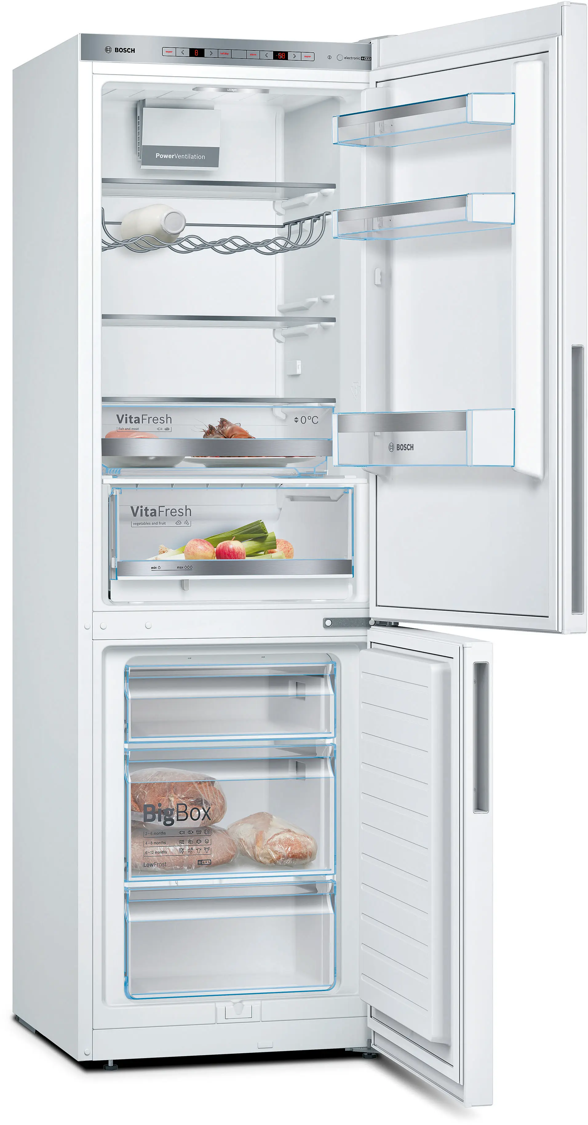 Combina frigorifică Bosch Seria 6 este o soluție eficientă și practică pentru bucătării moderne, oferind o capacitate totală de aproximativ 308 l (214 l frigider + 94 l congelator), tehnologie LowFrost pentru reducerea formării gheții și sistem VitaFresh pentru păstrarea alimentelor proaspete mai mult timp, într-un design alb elegant și ușor de integrat.