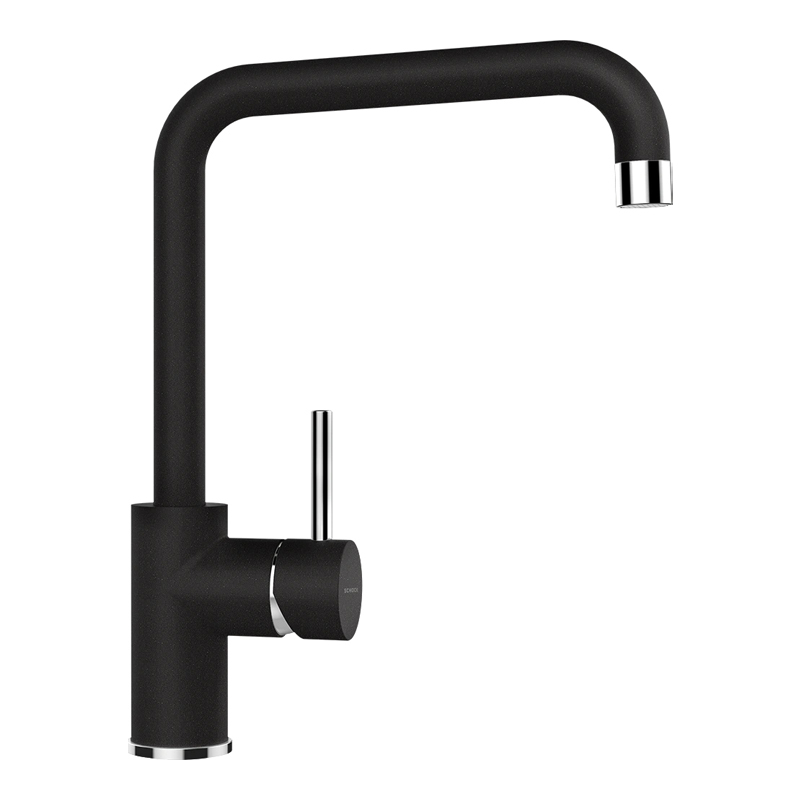 Baterie bucatarie Schock Fonos Cristalite Nero, aspect granit, cartus ceramic, negru aduce un design clasic, cu cap de baterie in J si in finisaj granit. Liniile drepte se imbina cu contururi usor curbate si inspira eleganta, in timp ce dimensiunile moderate fac ca aceasta baterie sa se integreze perfect in bucataria dvs., indiferent de pozitia de montare pentru care optati. Prin optiuni diverse de culoare, precum Nero, Asphalt, Croma, Moonstone si Alpina, aceasta baterie creeaza armonie perfecta alaturi de modele de chiuvete din granit.  Pentru confort la utilizare, bateria se poate roti la 360°, are un regulator brevetat si scurgere tip cascada pentru prevenirea depunerilor de calcar. Bateria este prevazuta cu disc cartus ceramic, usor de inlocuit prin inlaturarea partii de sus a bateriei. Pachetul de livrare include furtunuri de legatura flexibile de 350 mm si piulita de 3⁄8" si placa de stabilitate pentru montare deosebit de usoara si sigura. Pentru montarea bateriei este necesara o gaura de Ø 35 mm.