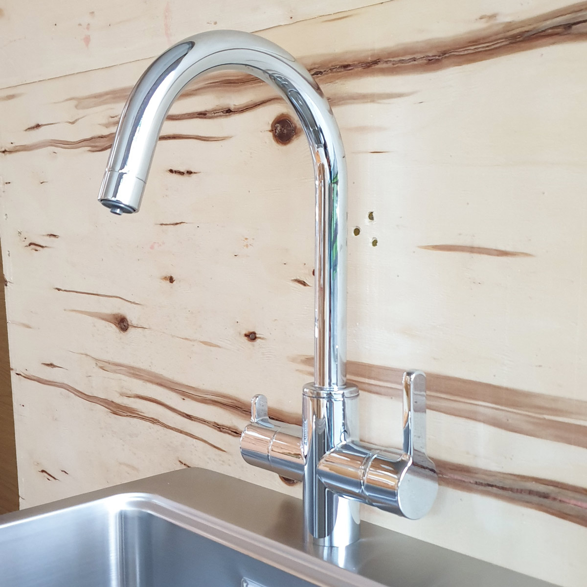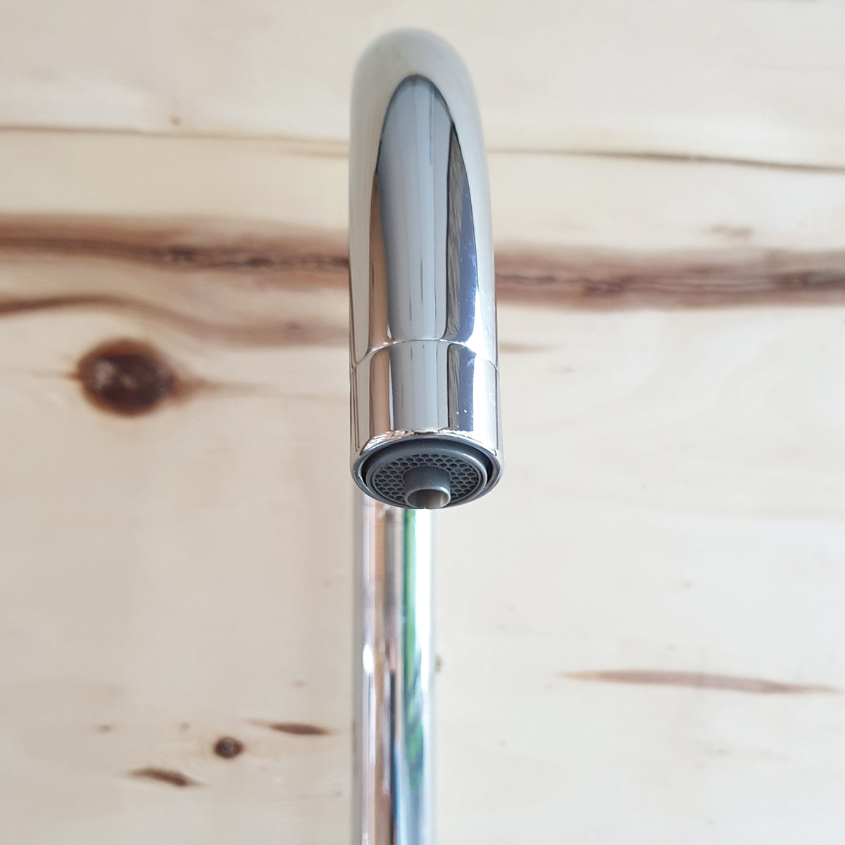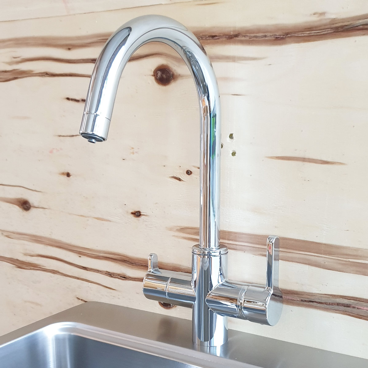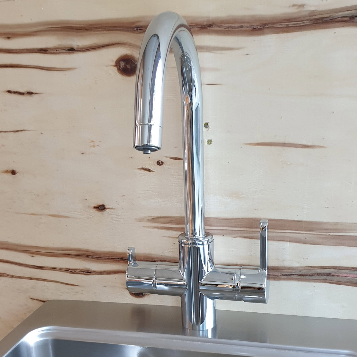 Este un model din gama premium, cu finisaj cromat, cu 2 manere de pornire a apei, unul pentru clasica apa rece si apa calda iar cel de al doilea maner este pentru pornirea si oprirea apei filtrate care are o pipa speciala subtire pe unde curge apa situata chiar prin mijlocul pipei standard (vezi in poze).