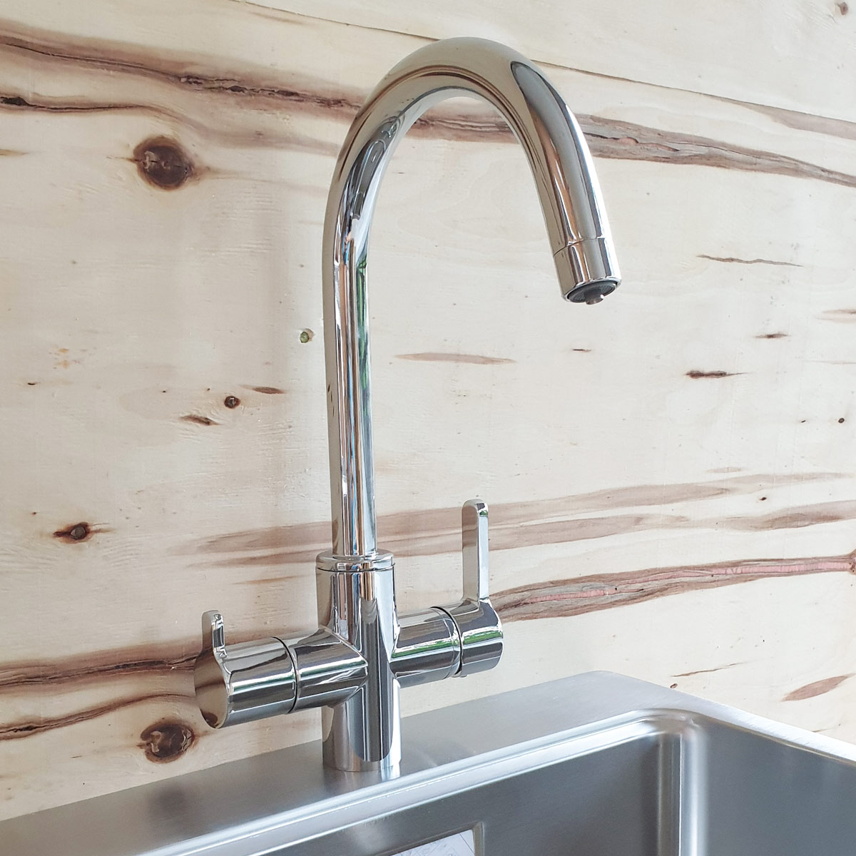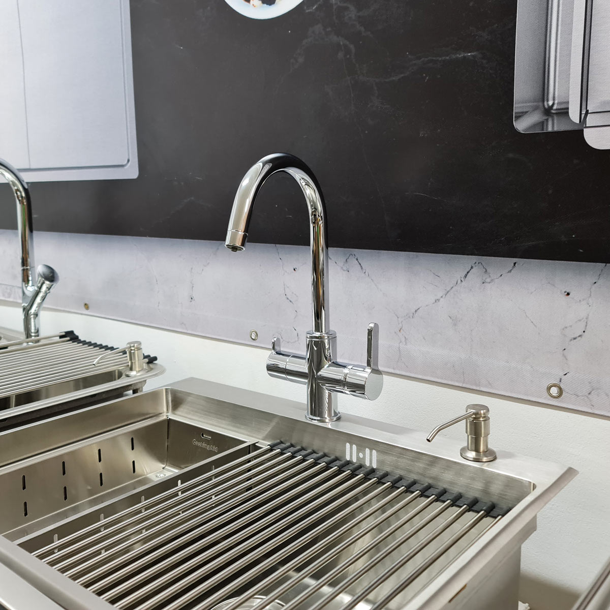 Bateria de chiuveta CookingAid Three Flow FLO60 este o baterie bicomanda premium cu 3 cai de o calitate exceptionala si cu cap rotativ care va furnizeaza atat apa calda si rece cat si apa dintr-un filtru de apa gen Kangen, Brita sau altele.