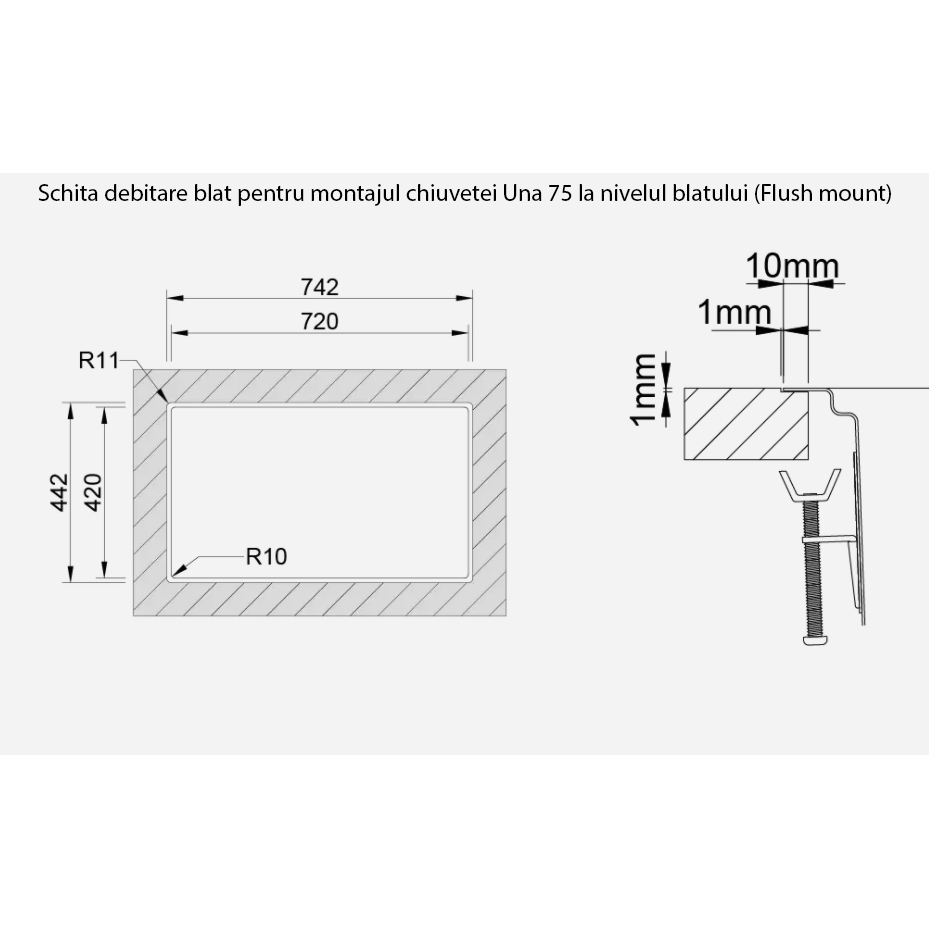 Decupajul necesar in blatul de bucatarie in cazul in care chiuveta se monteaza la nivelul blatului este de 720mm / 420mm cu colturi R10, cu un sanfren aditional in grosime de 1mm si latime de 11 mm perimetral pentru a acomoda marginea chiuvetei astfel samfrenul va fi de 742mm / 442mm (vezi schita detaliata la poze produs), dar recomandam taierea blatului doar in momentul in care ati primit chiuveta.