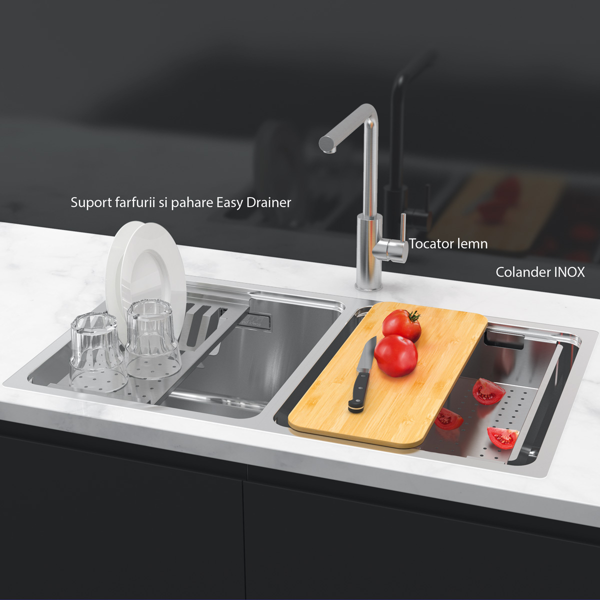 -Master Box Una compusa din 3 piese: un colander/tavita inox CookingAid Una, un scurgator de farfurii si pahare Easy Drainer si un tocator din lemn, toate personalizate pentru cuva chiuvetei Una 75 (vezi ultimele poze ale produsului ca exemplu).