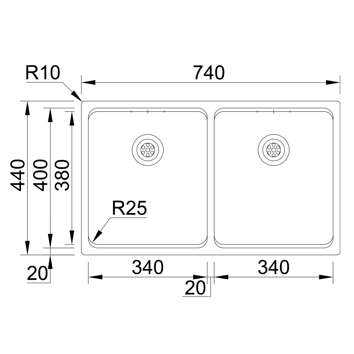 Raza de curbura a marginilor interioare ale chiuvetei este R25, informatie necesara a se comunica firmei care debiteaza pe CNC blatul de granit/compozit/HPL/HPC sau alt material rezistent la apa, in cazul montarii chiuvetei sub blat.