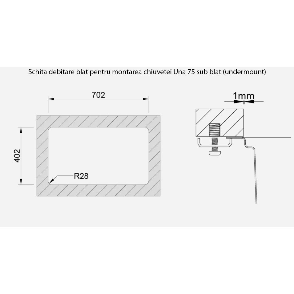 Decupajul necesar in blatul de bucatarie in cazul in care chiuveta se monteaza sub blat este de 702mm / 402mm (vezi schita detaliata la poze produs) cu colturi R28, dar recomandam taierea blatului doar in momentul in care ati primit chiuveta.