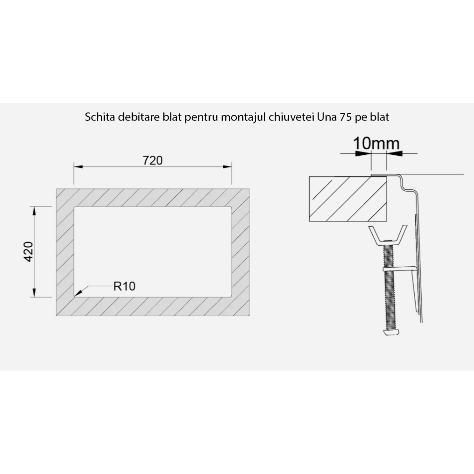 Decupajul necesar in blatul de bucatarie in cazul in care chiuveta se monteaza pe blat este de 720mm / 420mm (vezi schita detaliata la poze produs) cu colturi R10, dar recomandam taierea blatului doar in momentul in care ati primit chiuveta.