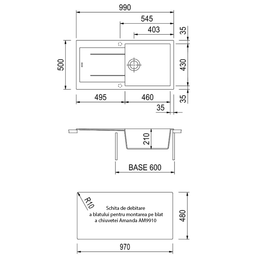 Decupajul necesar in blatul de bucatarie pentru montarea chiuvetei pe blat este de 970mm / 480mm, dar recomandam taierea blatului doar in momentul in care ati primit chiuveta. Corpul de mobilier pentru chiuveta de bucatarie recomandat de producator este de 600mm lungime.