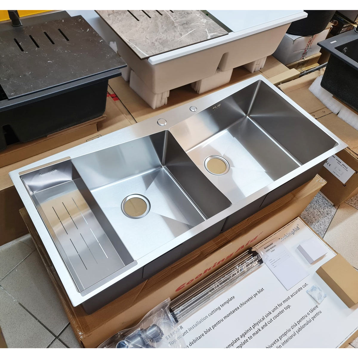 Chiuveta de bucatarie CookingAid Venus-R Workstation, este o chiuveta cu doua cuve foarte mari din gama Premium a CookingAid, practic una din varfurile de gama al producatorului, recomantata atat pentru domeniul casnic pentru familii numeroase, bucatarii mari, foisoare si celor care isi doresc o chiuveta mai mare decat chiuvetele clasice de pe piata cat si pentru domeniul HORECA cum sunt bucatariile de restaurante, sali de nunti / evenimente, manastiri, spitale, clinici, hoteluri si pensiuni, cantine, furnizorii de servicii de catering unde accesoriile care vin inclus cu statia de lucru workstation sunt atat utile cat si necesare.