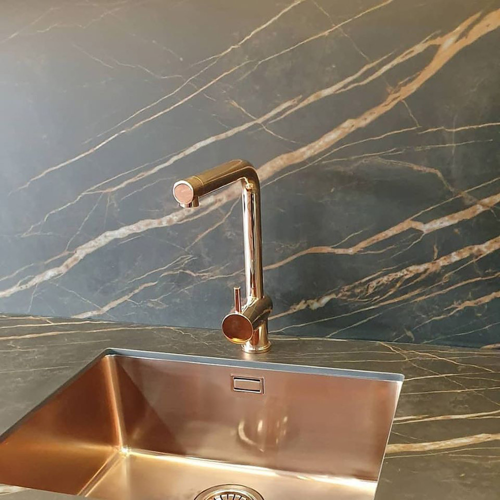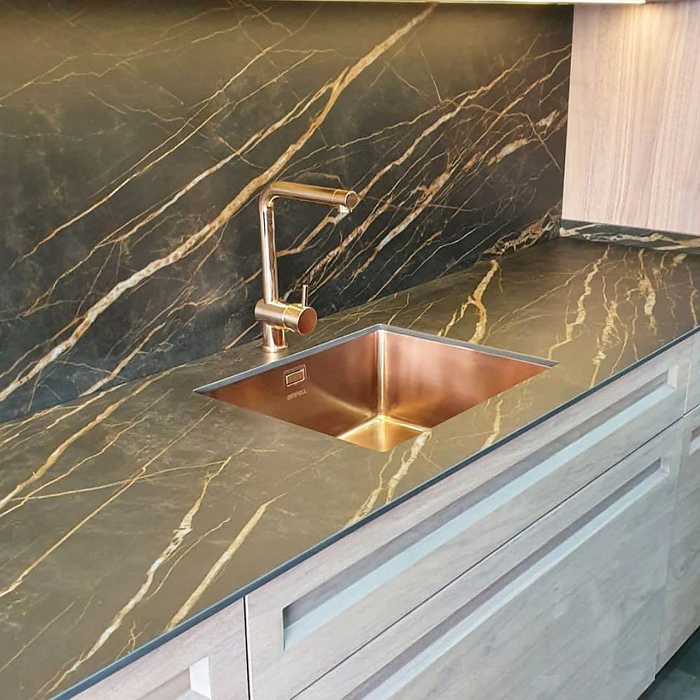 Chiuveta Box Lux 50 Copper cu un aer minimalist, este sudata din otel inoxidabil periat 18/10 si se poate monta fie pe blat fie la nivelul blatului, avand o buza superioara simpla si subtire de doar 1.2mm grosime, fara tesituri sau alte indoiri, asadar se imbina perfect cu blatul fara acea margine ridicata specifica la chiuvetele standard.