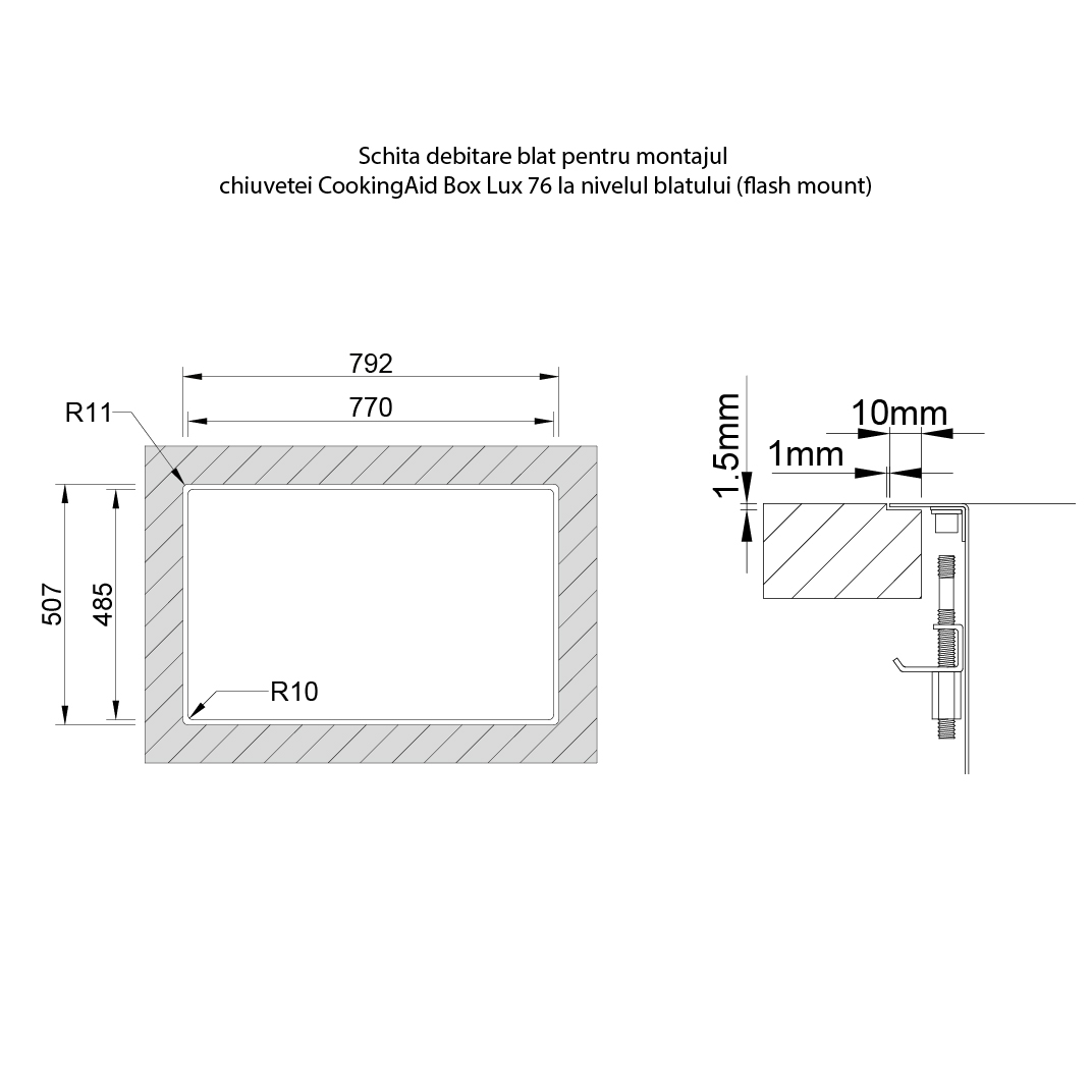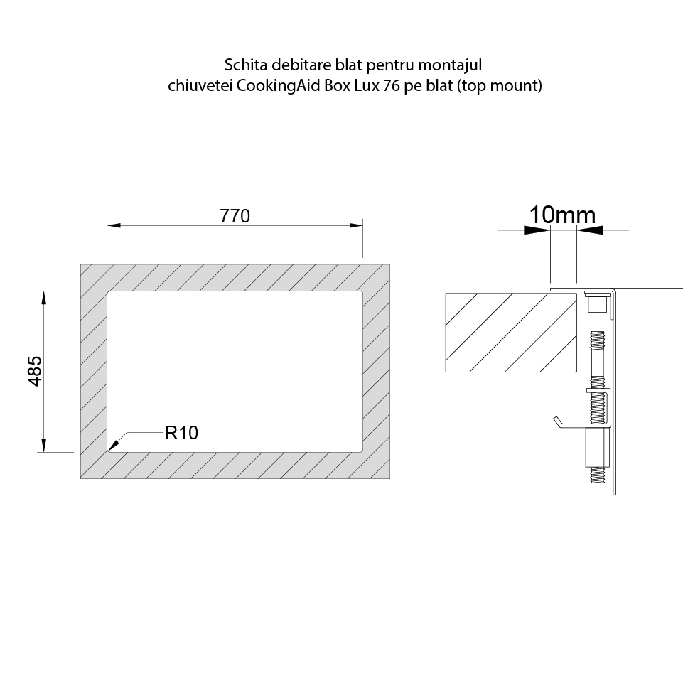 Decupajul necesar in blatul de bucatarie in cazul in care chiuveta se monteaza pe blat este de 770mm / 485mm, dar recomandam taierea blatului doar in momentul in care ati primit chiuveta. Corpul de mobilier pentru chiuveta de bucatarie recomandat de producator este de 900mm lungime.