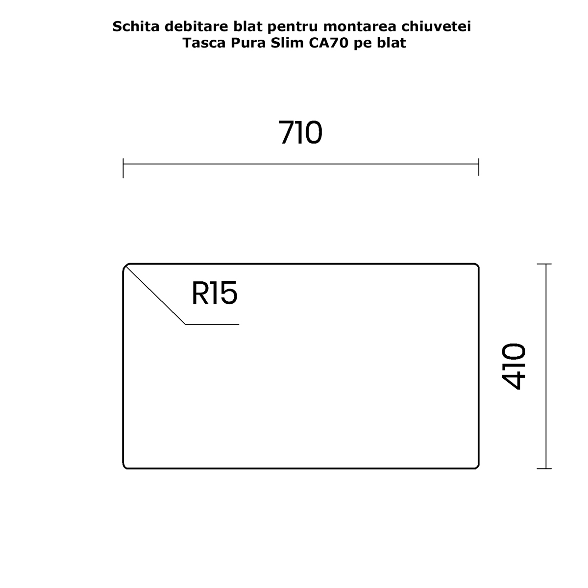 Decupajul necesar in blatul de bucatarie in cazul in care chiuveta se monteaza pe blat (montaj numit si topmount sau overmount) este de 710mm / 410mm (vezi schita detaliata la poze produs) cu colturi cu raza exacta R15, dar recomandam taierea blatului doar in momentul in care ati primit chiuveta.