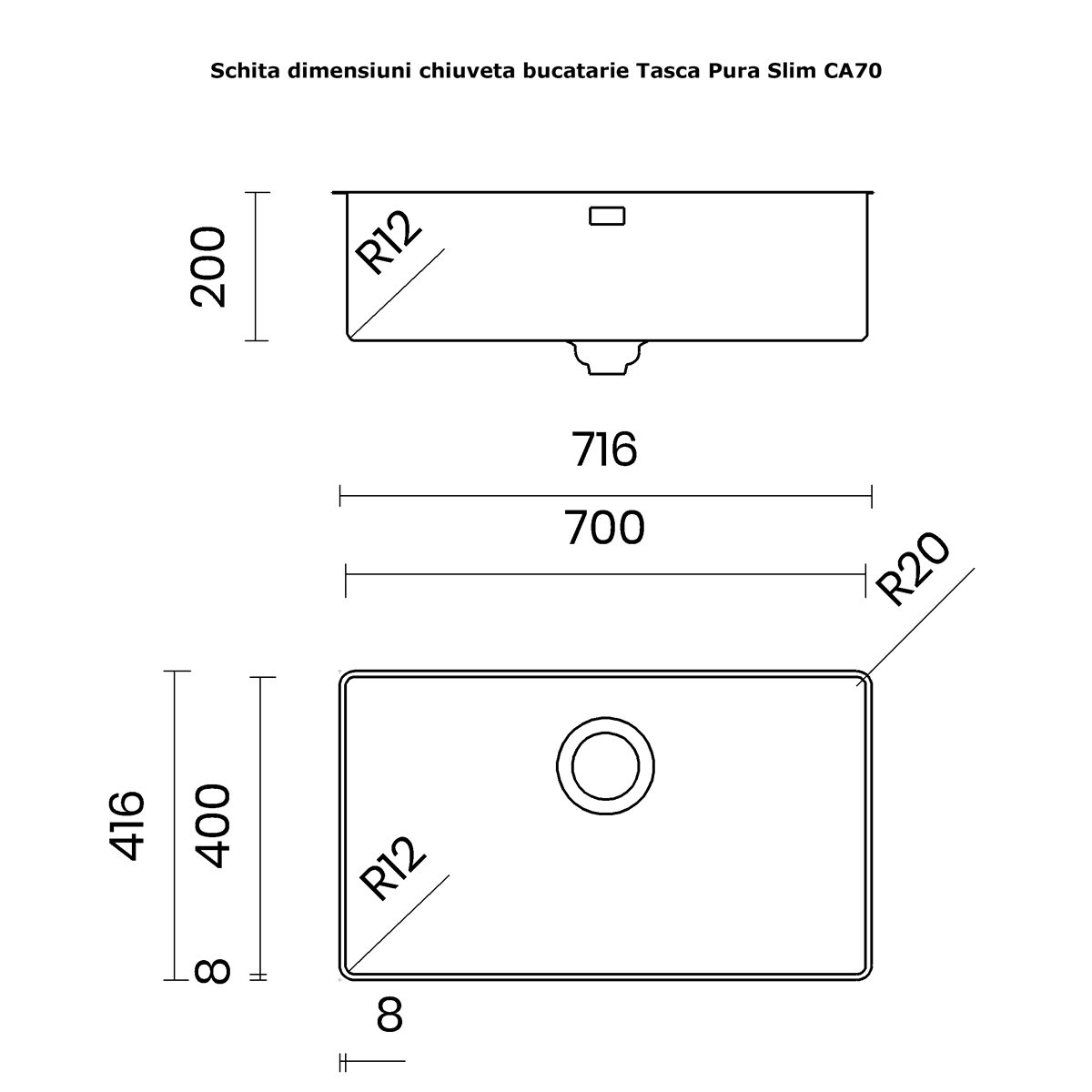 Dimensiunea exterioara a chiuvetei este de 716mm lungime / 416mm latime / 200mm inaltime,