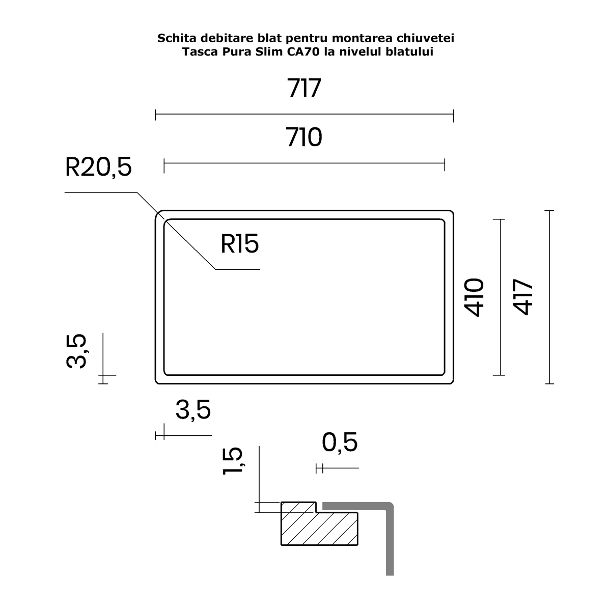 Decupajul necesar in blatul de bucatarie in cazul in care chiuveta se monteaza la nivelul blatului (montaj numit si incastrat, ingropat sau filotop) este de 710mm / 410mm cu colturi cu raza R15, cu un sanfren aditional in grosime de 1.5mm din blat perimetral pentru a acomoda/ascunde marginea chiuvetei astfel chenarul acestui sanfren va fi de 717mm / 417mm cu o raza de curbura la colturi R20.5 (vezi schita detaliata la poze produs), dar recomandam taierea blatului doar in momentul in care ati primit chiuveta. Aceste informatii sunt recomandate a se comunica firmei care debiteaza si realizeaza sanfrenul pe CNC pentru blatul de granit/compozit/HPL/HPC sau alt material rezistent la apa.