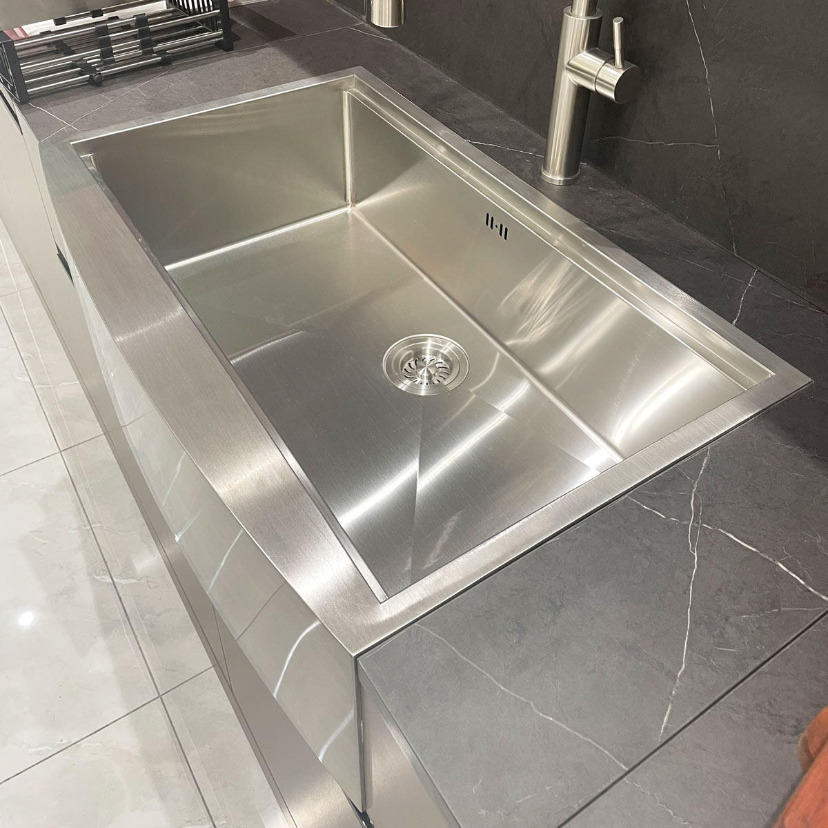 Chiuveta CookingAid Farm House Apron Workstation este o chiuveta adanca din gama Handmade, cu o singura cuva de dimensiuni generoase, produsa din otel alimentar inoxidabil 18/10 sau SUS304, de calitate premium, cu o grosime a inoxului de 1.2mm, ceea ce ii confera rezistenta la socuri mecanice, precum si rezistenta la coroziune.