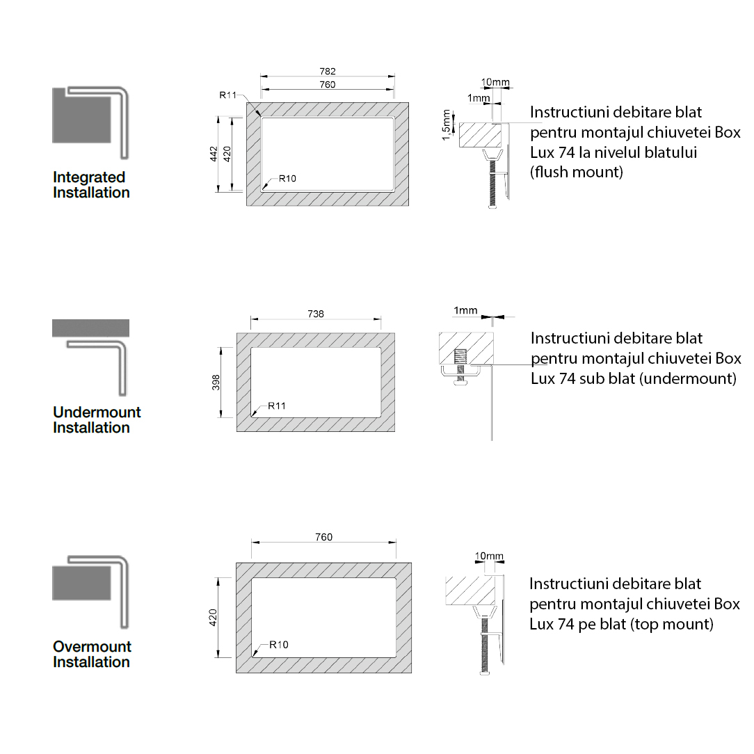 Decupajul necesar in blatul de bucatarie in cazul in care chiuveta se monteaza la nivelul blatului este de 760mm / 420mm cu colturi R10, cu un sanfren aditional in grosime de 1mm si latime de 11 mm perimetral pentru a acomoda marginea chiuvetei astfel samfrenul va fi de 782mm / 442mm (vezi schita detaliata la poze produs), dar recomandam taierea blatului doar in momentul in care ati primit chiuveta.