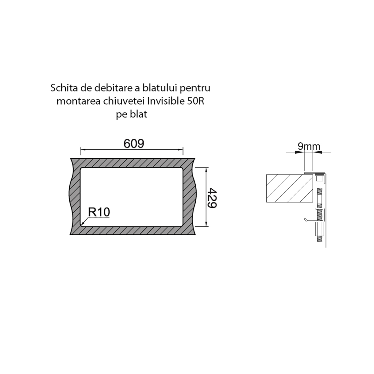 Decupajul necesar in blatul de bucatarie in cazul in care chiuveta Invisible 50R se monteaza pe blat (montaj numit si topmount sau overmount) este de 609mm / 429mm.