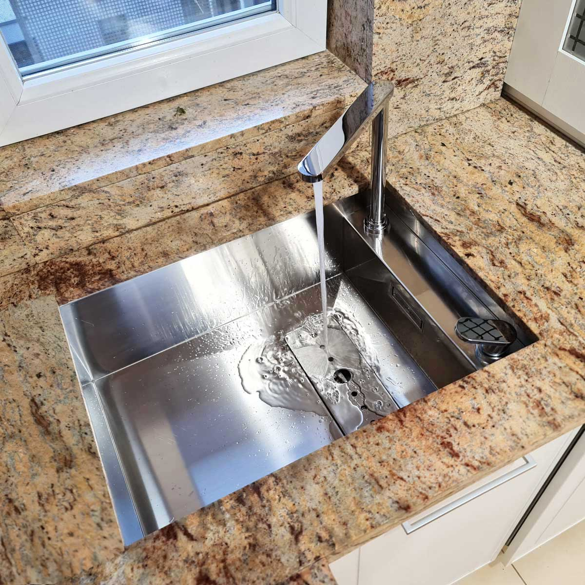 Chiuveta Invisible 50R cu un aer minimalist, este sudata din otel inoxidabil periat 18/10 si este proiectata cu un ventil si un preaplin dreptunghiular, ambele modele patentate, unice in lumea producatorilor de chiuvete de inox.