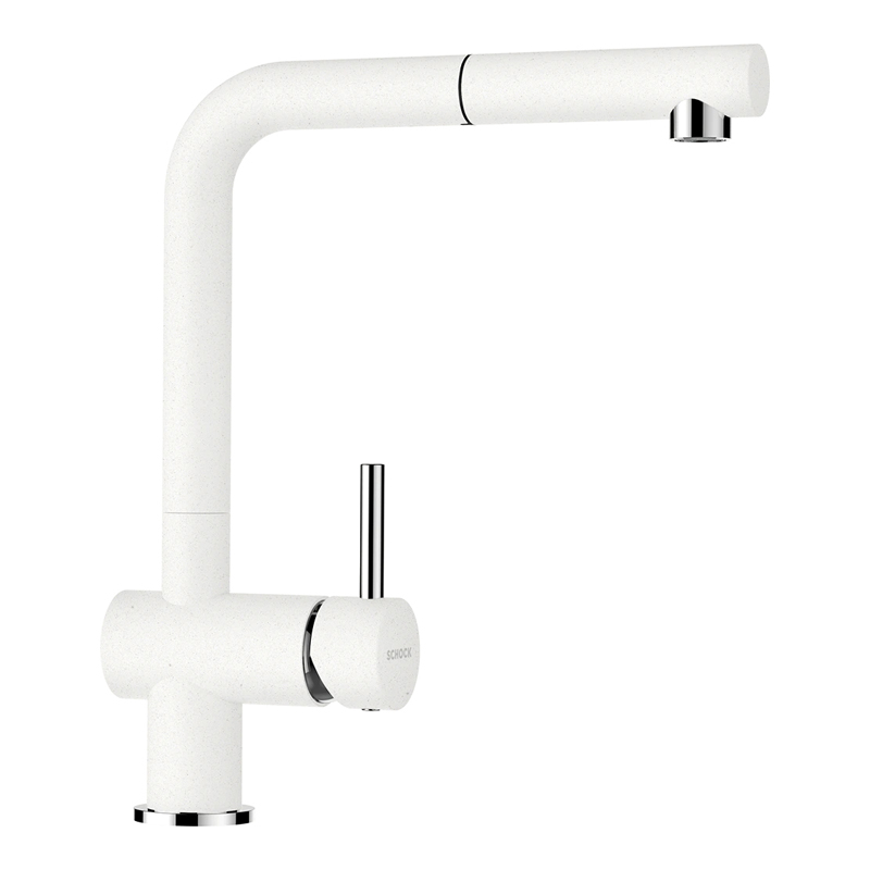 Baterie bucatarie Schock Epos Cristalite Alpina cu cap extractibil, aspect granit, cartus ceramic, alb - aduce functionalitate optima intr-o bucatarie unde numeroasele sarcinile si rigori impun eficienta maxima. Pentru un plus de design practic, Schock a integrat un cartus ceramic mai mare in aceasta baterie, care asigura un debit crescut de apa. In plus, gatul inalt al bateriei este deosebit de eficient la umplerea vazelor si a recipientelor inalte. Functia de economisire a apei este menita sa protejeze mediul inconjurator, in timp ce confortul la utilizare inseamna si usurinta fara precedent la curatare. Optiuni de culoare, precum Alpina, Asphalt, Beton, Croma, Moonstone și Alpina ofera multiple posibilitati de integrare in designul bucatariei, precum si optiuni diverse de potrivire cu modele de chiuvete din granit. Pachetul de livrare include furtunuri de legatura flexibile de 450 mm si piulita de 3⁄8" si placa de stabilitate pentru montare deosebit de usoara si sigura. Pentru montarea bateriei este necesara o gaura de Ø 35 mm.