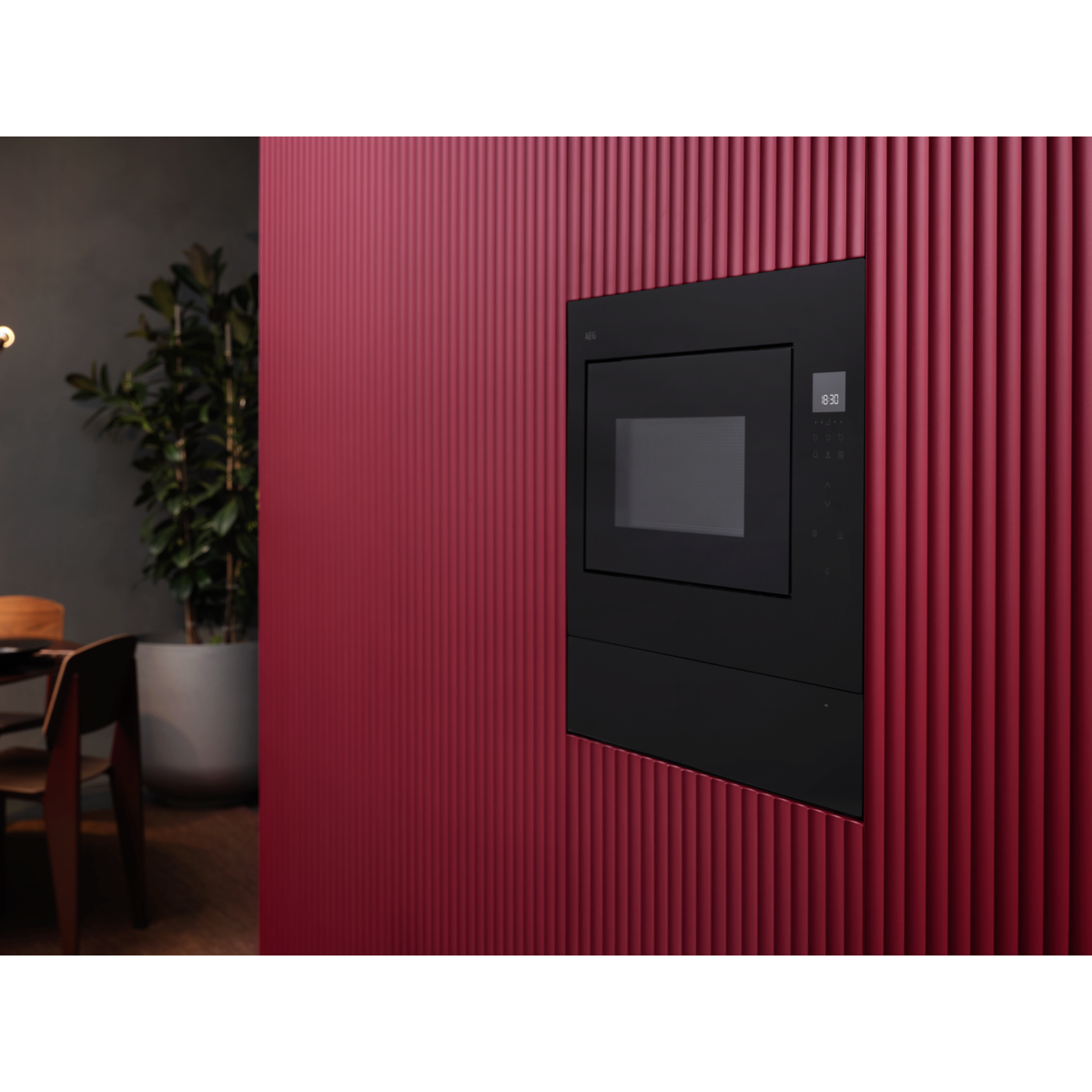 Designul elegant și minimalist al cuptorului cu microunde, negru lucios, se asortează cu cuptorul și cu celelalte aparate.