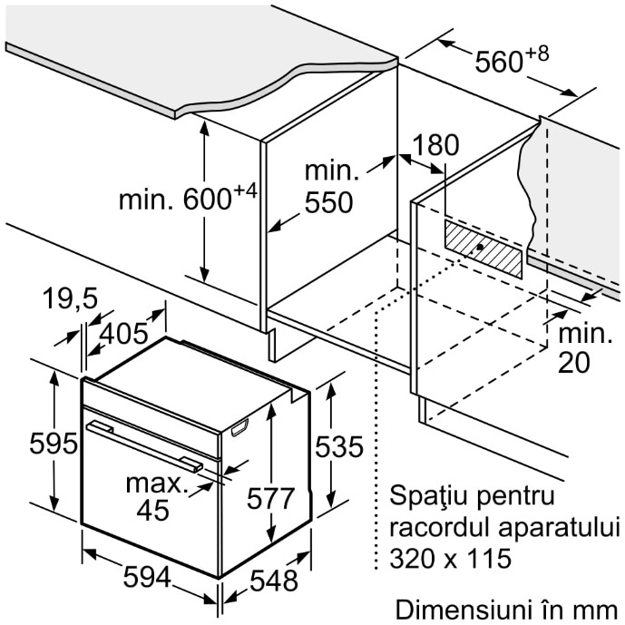 | Dimensiuni nișă (ÎxLxA): 560 mm - 568 mm x 585 mm - 595 mm x 550 mm |