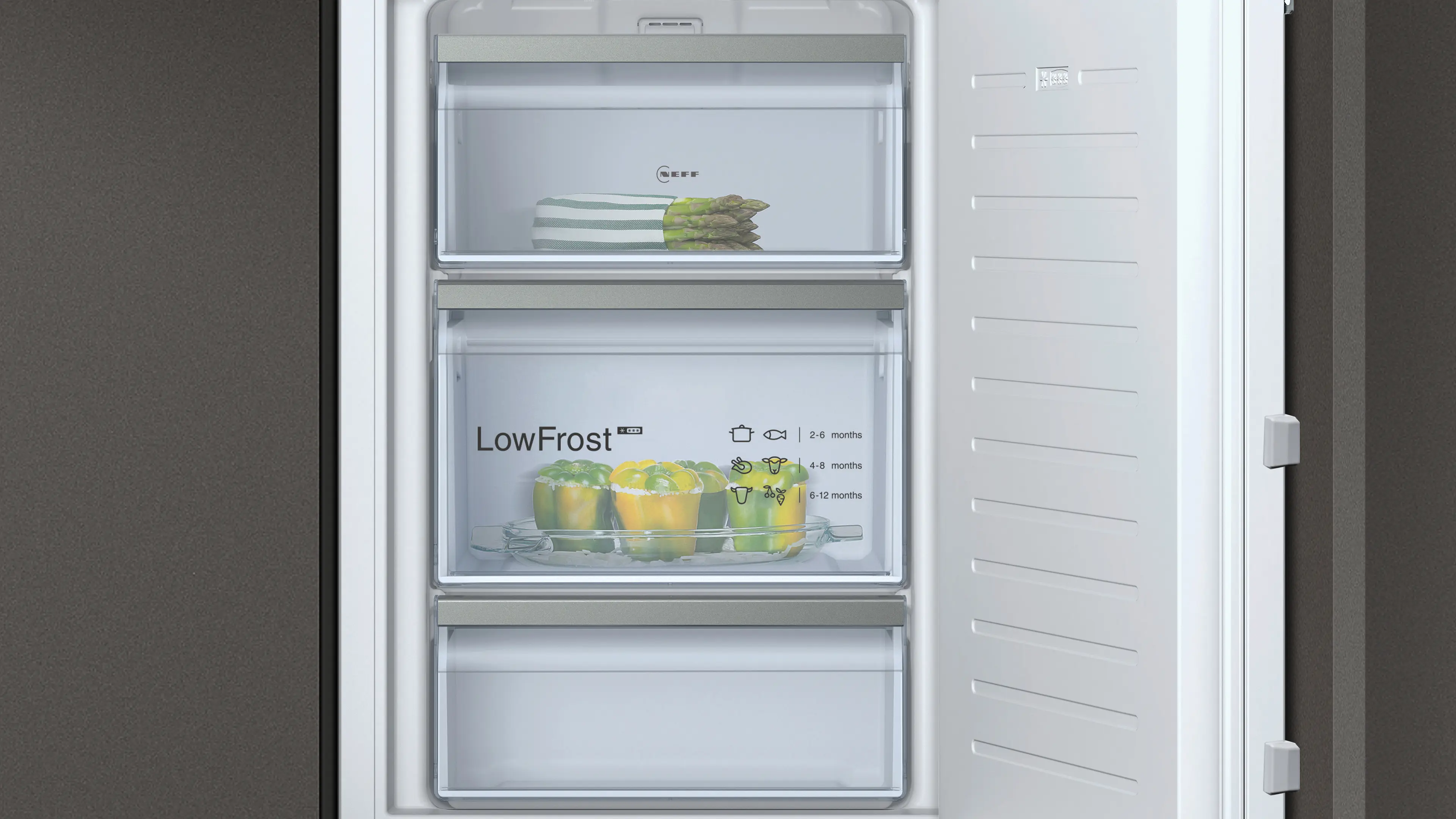Compartiment Big Box pentru alimente voluminoase, balamale Soft Close pentru închidere silențioasă și tehnologie Low Frost pentru o întreținere mai ușoară.