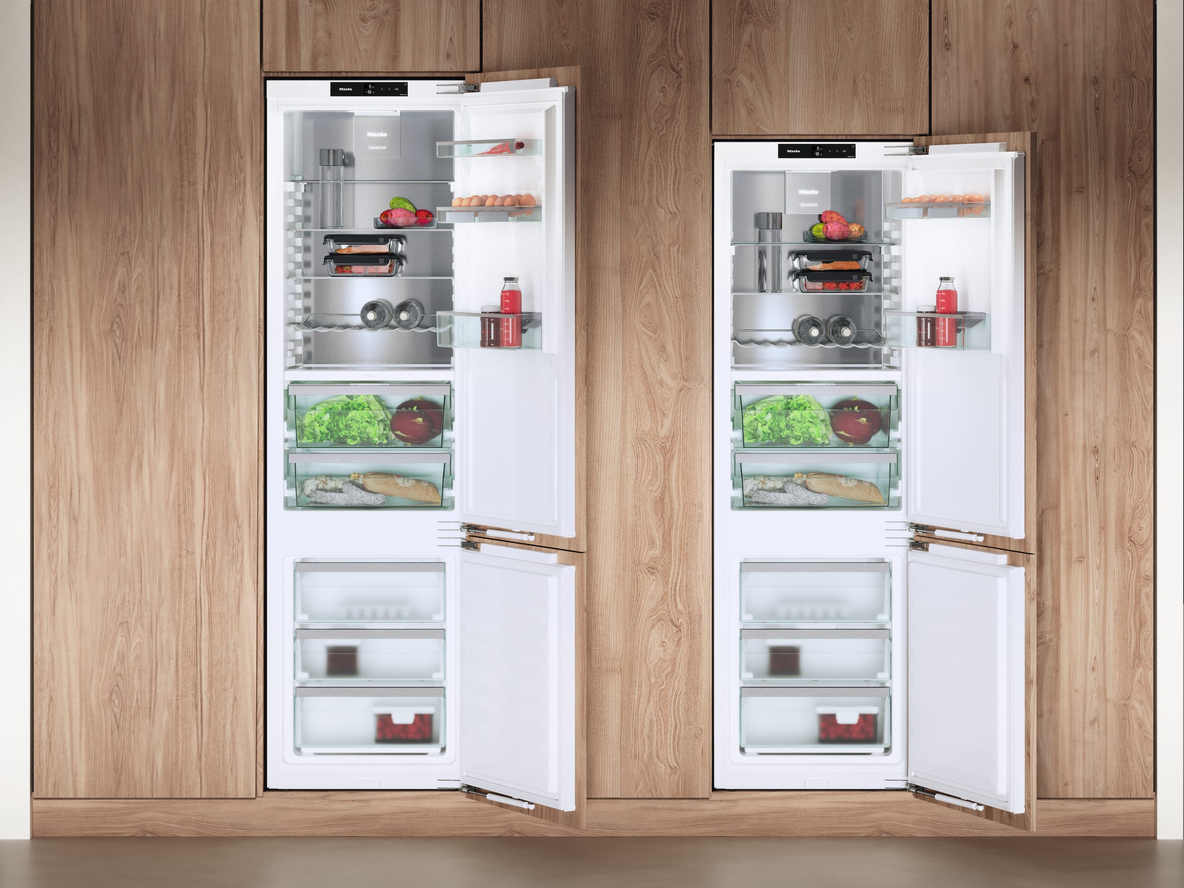 17 % mai mult spațiu decât nișele de încastrare standard: cu 29 l mai mult volum în secțiunea frigider în comparație cu modelul KFN 7744 C (înălțimea nișei de încastrare 178 cm), chiar și articolele mari vor găsi suficient spațiu în interiorul aparatului dvs. Raftul suplimentar din sticlă și rafturile ușii oferă și mai multă flexibilitate pentru depozitarea alimentelor.