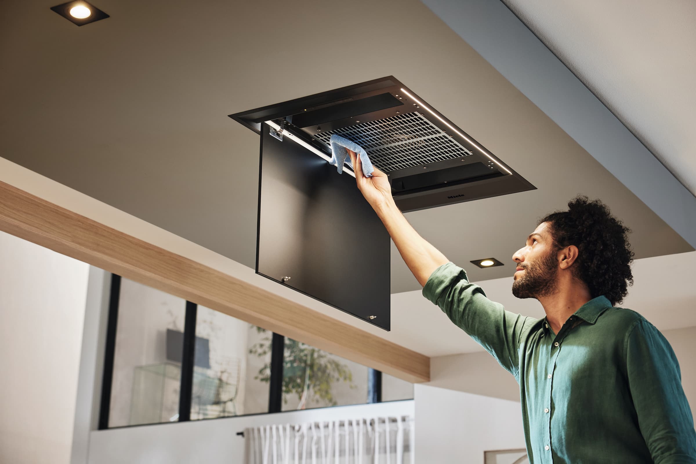 Situat în spatele filtrelor de grăsime ale accesoriului CleanCoverde la Miele: În locul muchiilor metalice ascuţite şi a componentelor electrice, veţi găsi numai o suprafaţă fină, etanşată. Suprafaţa este deosebit de uşor de curăţat şi vă protejează de contactul cu cablurile şi componentele motorului. Atenţie la detalii specifică pentru Miele - pentru confortul şi siguranţa dvs.