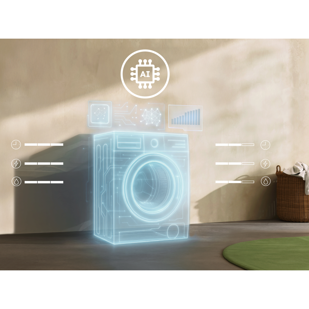 AI WashAssist: Tehnologie avansată de detectare a încărcăturii SensiCare, bazată pe algoritm AI, care ajustează durata ciclului, cantitatea de apă și energia în funcţie de cantitatea de rufe*, reducând consumul cu până la 30%**.