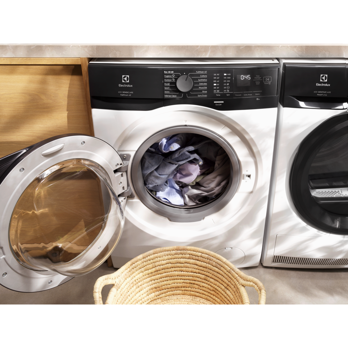 Programul FullWash 45': Gata în 45 de minute la 30°C, chiar și pentru o încărcătură completă. Ideal pentru haine de zi cu zi, ușor murdare, din ţesături mixte și bumbac colorat.