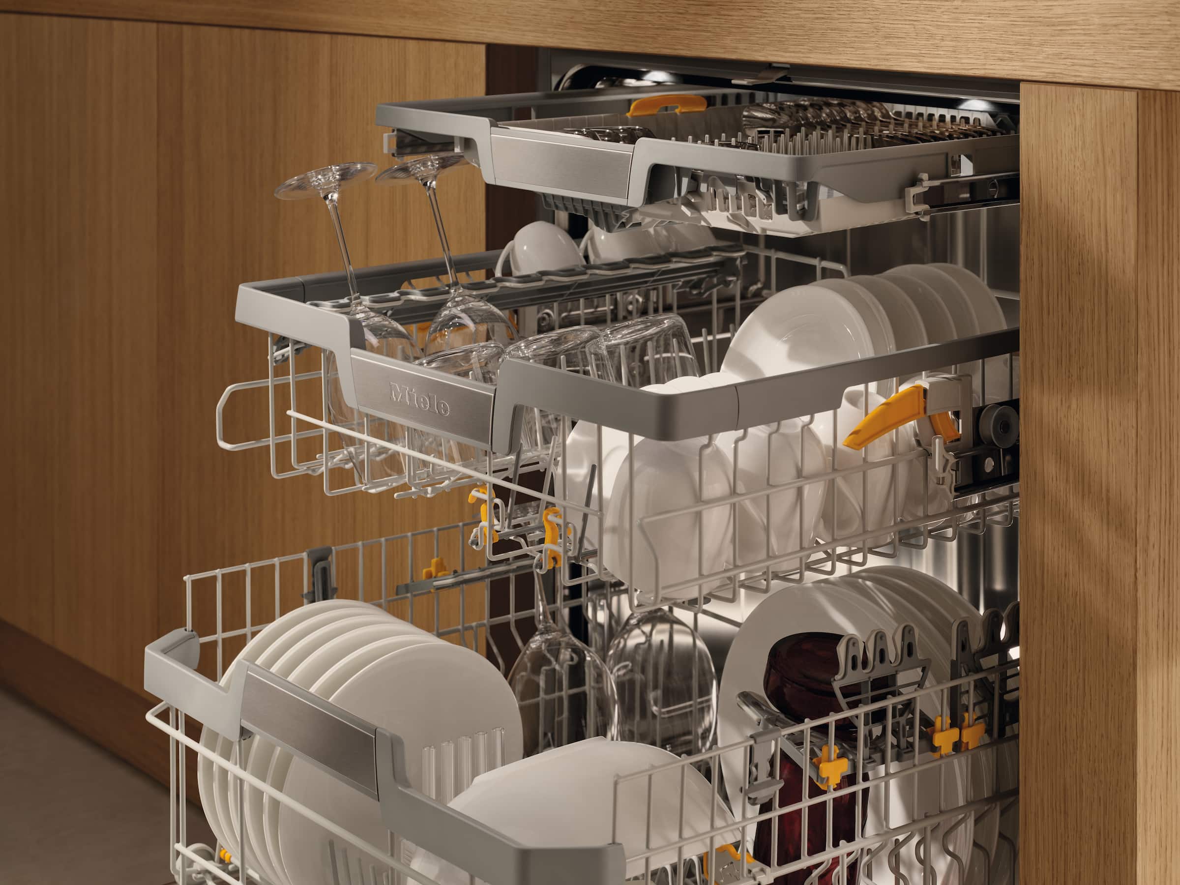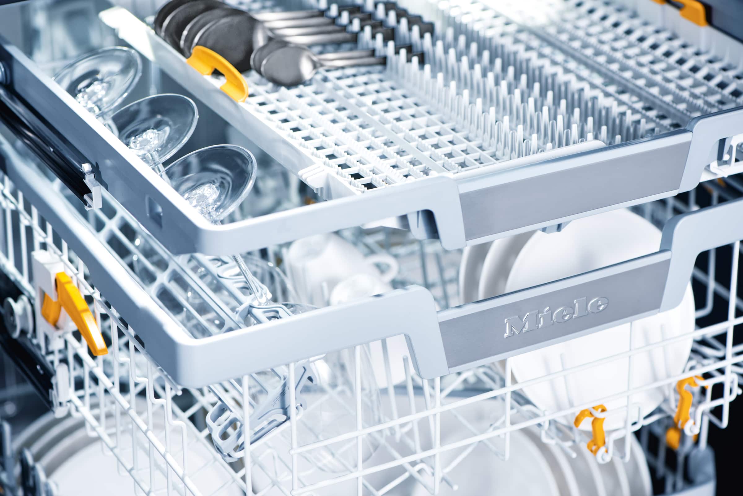 Mașinile de spălat vase Miele oferă spațiu pentru până la 14 seturi standard. Coșurile noastre asigură conformitatea cu standardele relevante, în timp ce vă îndeplinesc dorințele și nevoile. Acest lucru înseamnă că toate vasele dvs. vor fi poziționate perfect și sunt curățate și uscate în detaliu.