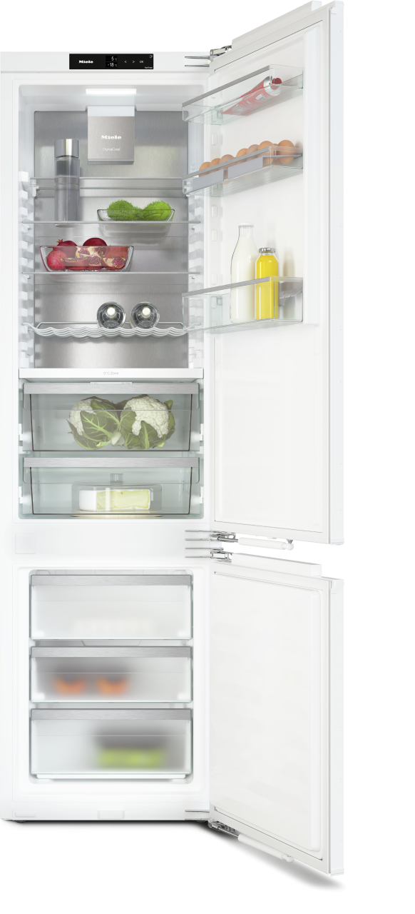 17 % mai mult spațiu decât nișele de încastrare standard: cu 29 l mai mult volum în secțiunea frigider în comparație cu modelul KFN 7744 C (înălțimea nișei de încastrare 178 cm), chiar și articolele mari vor găsi suficient spațiu în interiorul aparatului dvs. Raftul suplimentar din sticlă și rafturile ușii oferă și mai multă flexibilitate pentru depozitarea alimentelor.