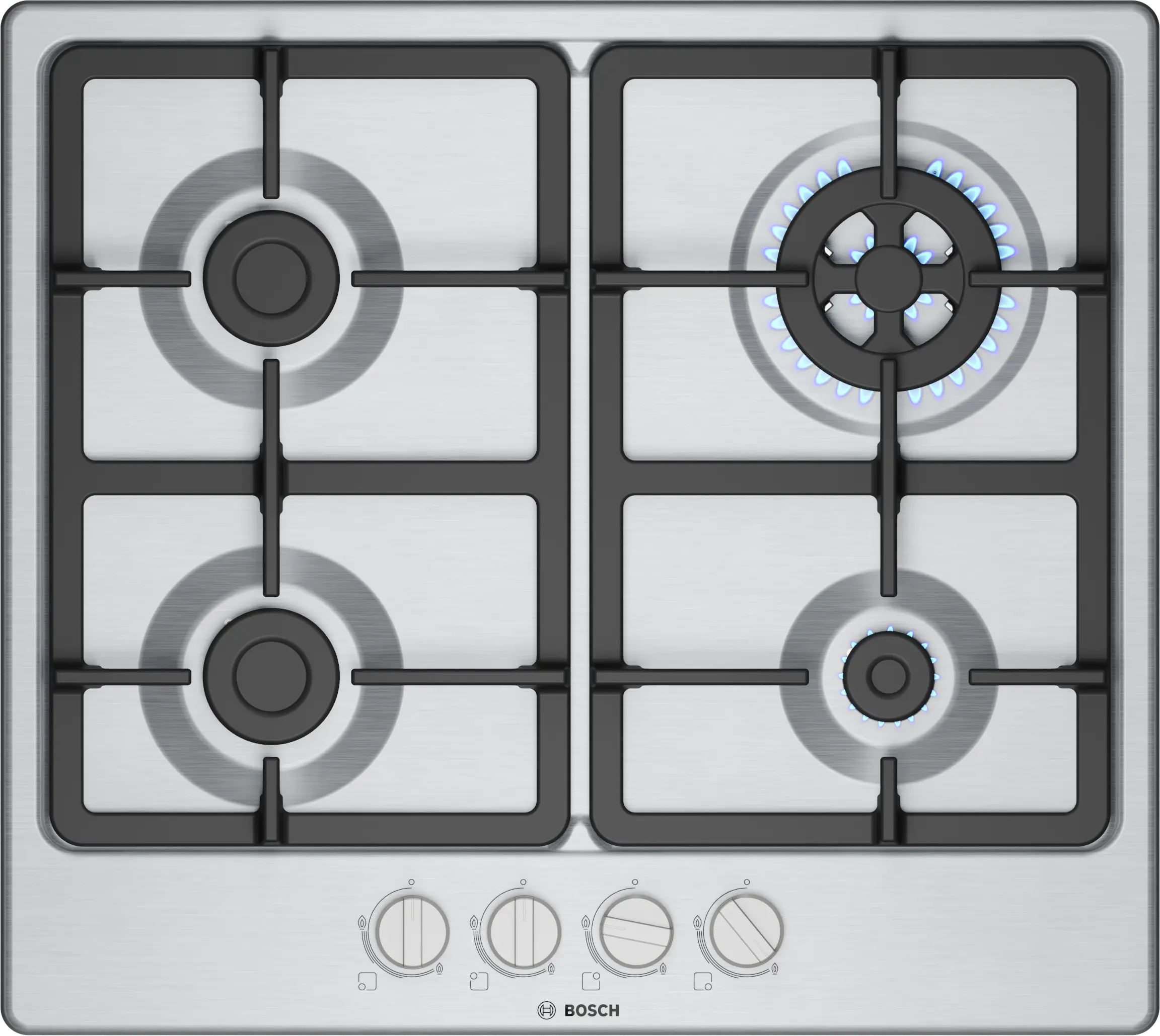 Plita pe gaz Bosch Seria 4 oferă control precis și siguranță în utilizare, fiind echipată cu 4 arzătoare performante, inclusiv arzător Wok pentru putere ridicată. Suporturile din fontă asigură stabilitate maximă, iar sistemul de siguranță oprește automat gazul în cazul stingerii flăcării. Designul din inox completează perfect orice bucătărie modernă.
