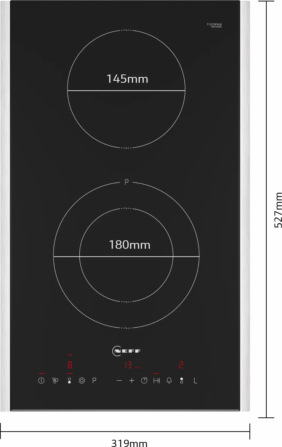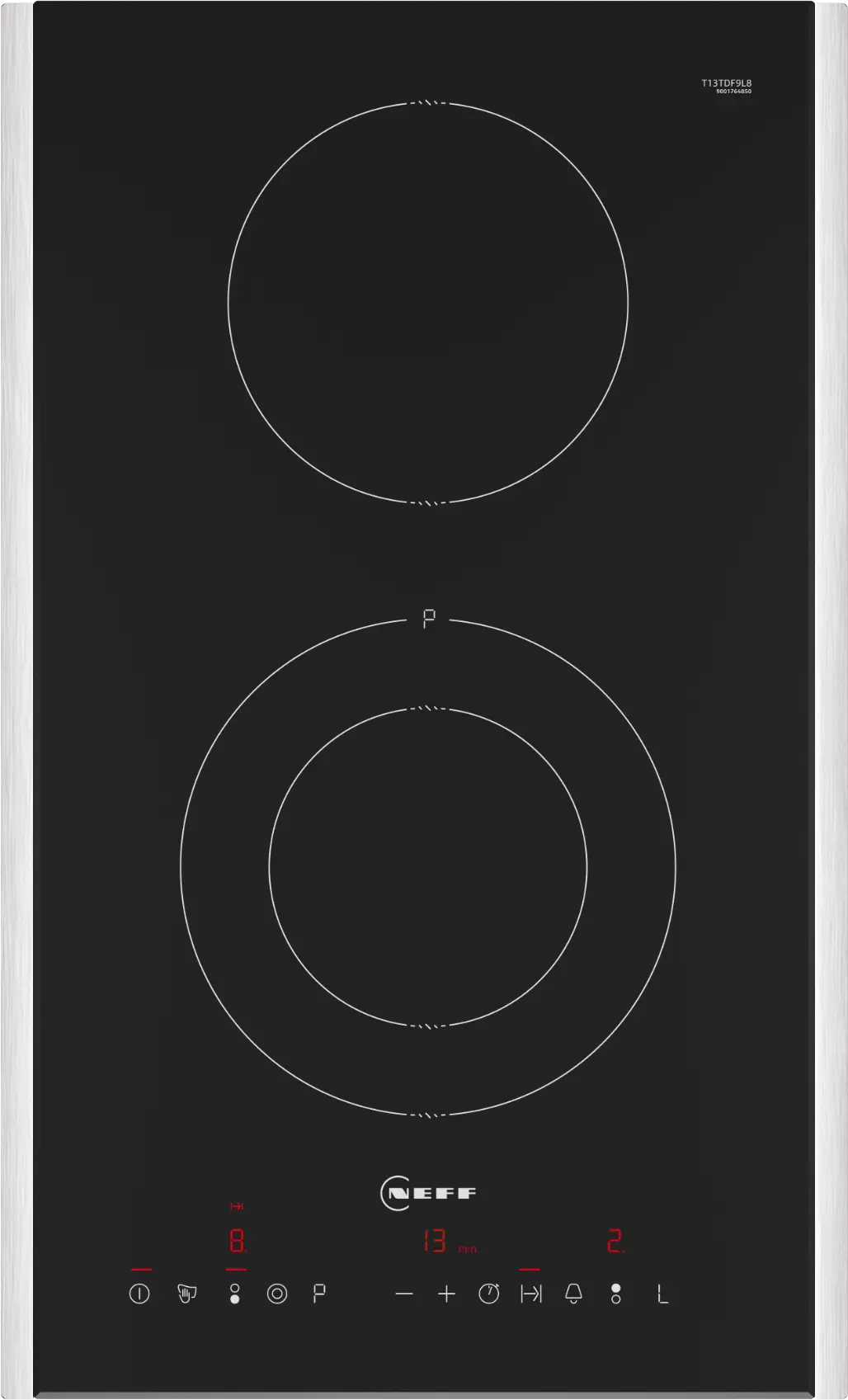 Plită vitroceramică Domino NEFF N70 T13TDF9L8, 30 cm, TouchControl, PowerBoost, 2 zone de gătit, ramă inox, Negru