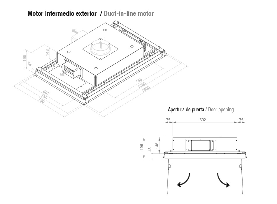 - Acest model cu motor V.1130 ECO PLUS include în standard 2 m de tub circular spiralat de extracție a fumului cu diametrul de Ø150.
