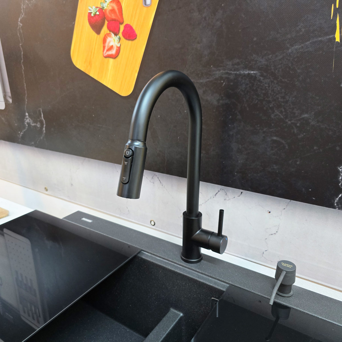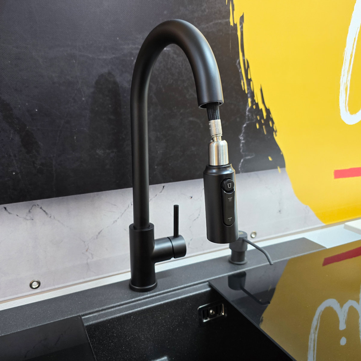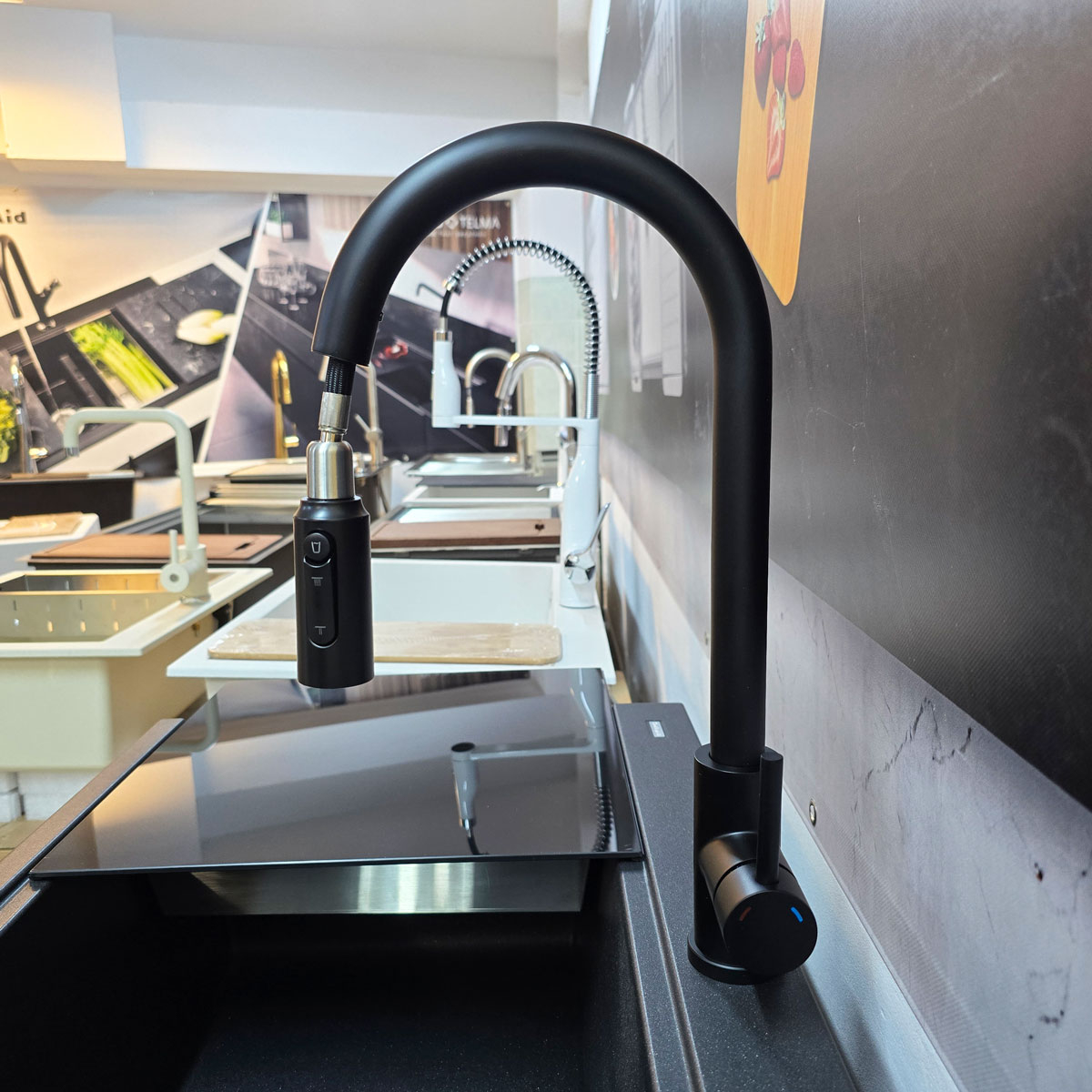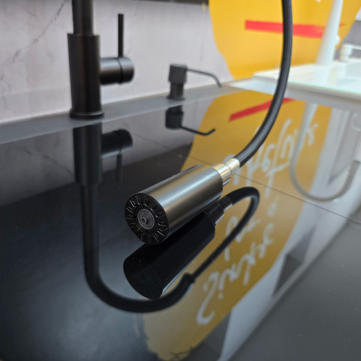 Este un model din gama premium, de culoare negru mat si perlator extractibil/detasabil, monocomanda + buton perlator pornire/oprire apa filtrata. Manerul monocomanda actioneaza apa rece si apa calda iar butonul situat pe perlator controleaza pornirea si oprirea apei filtrate (vezi in poze).