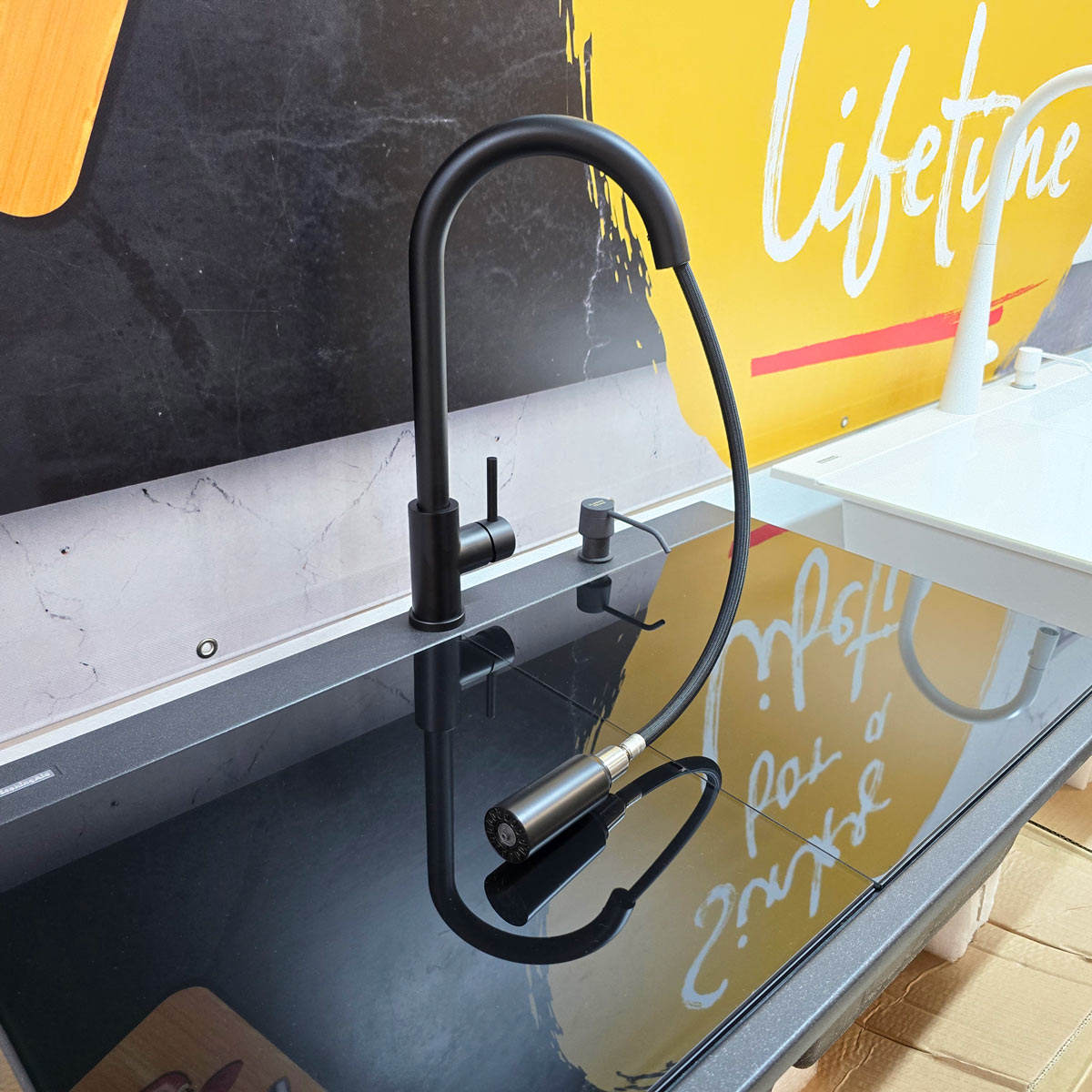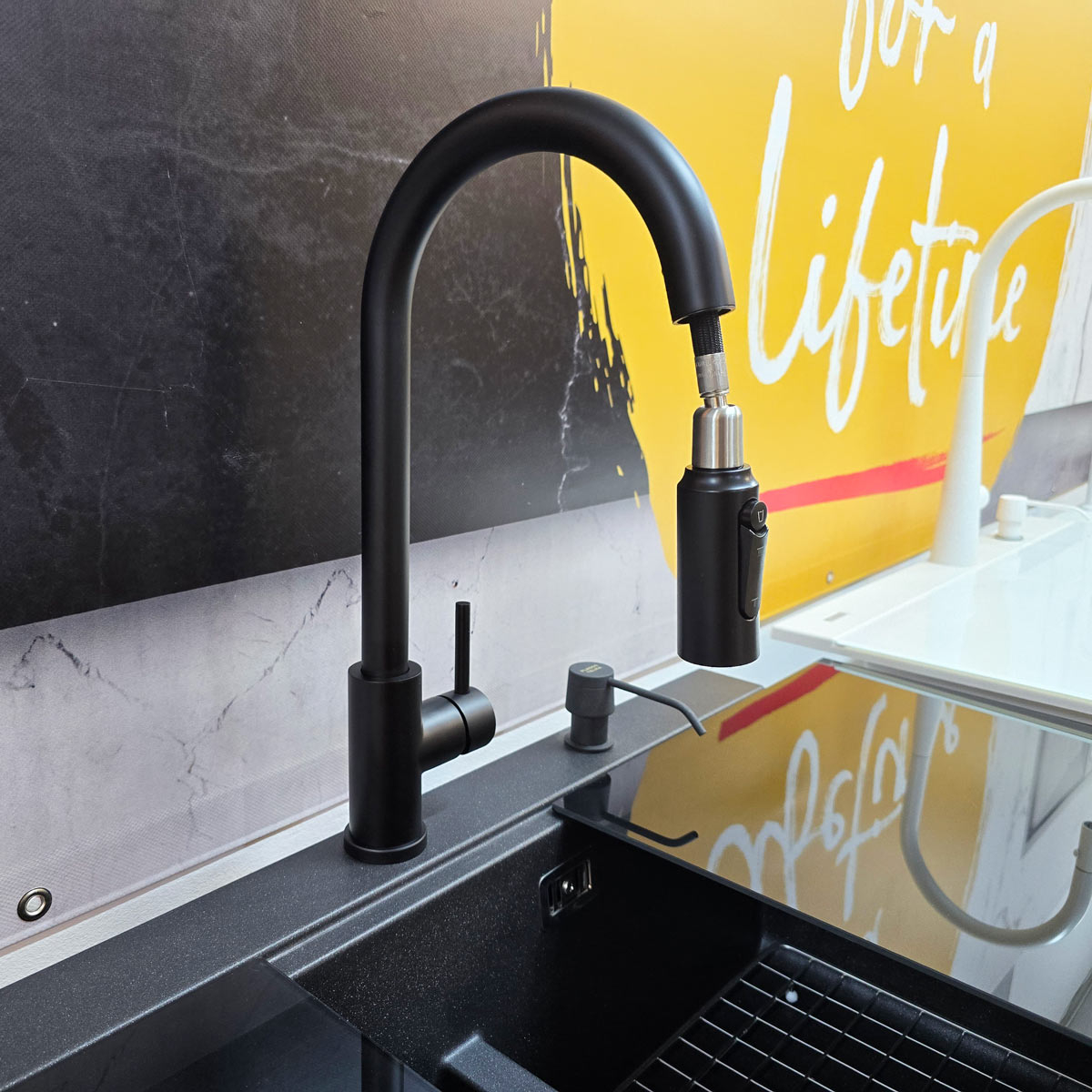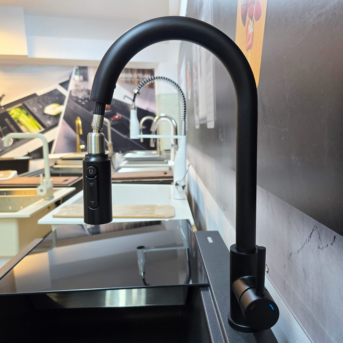 Este un model din gama premium, de culoare negru mat si perlator extractibil/detasabil, monocomanda + buton perlator pornire/oprire apa filtrata. Manerul monocomanda actioneaza apa rece si apa calda iar butonul situat pe perlator controleaza pornirea si oprirea apei filtrate (vezi in poze).
