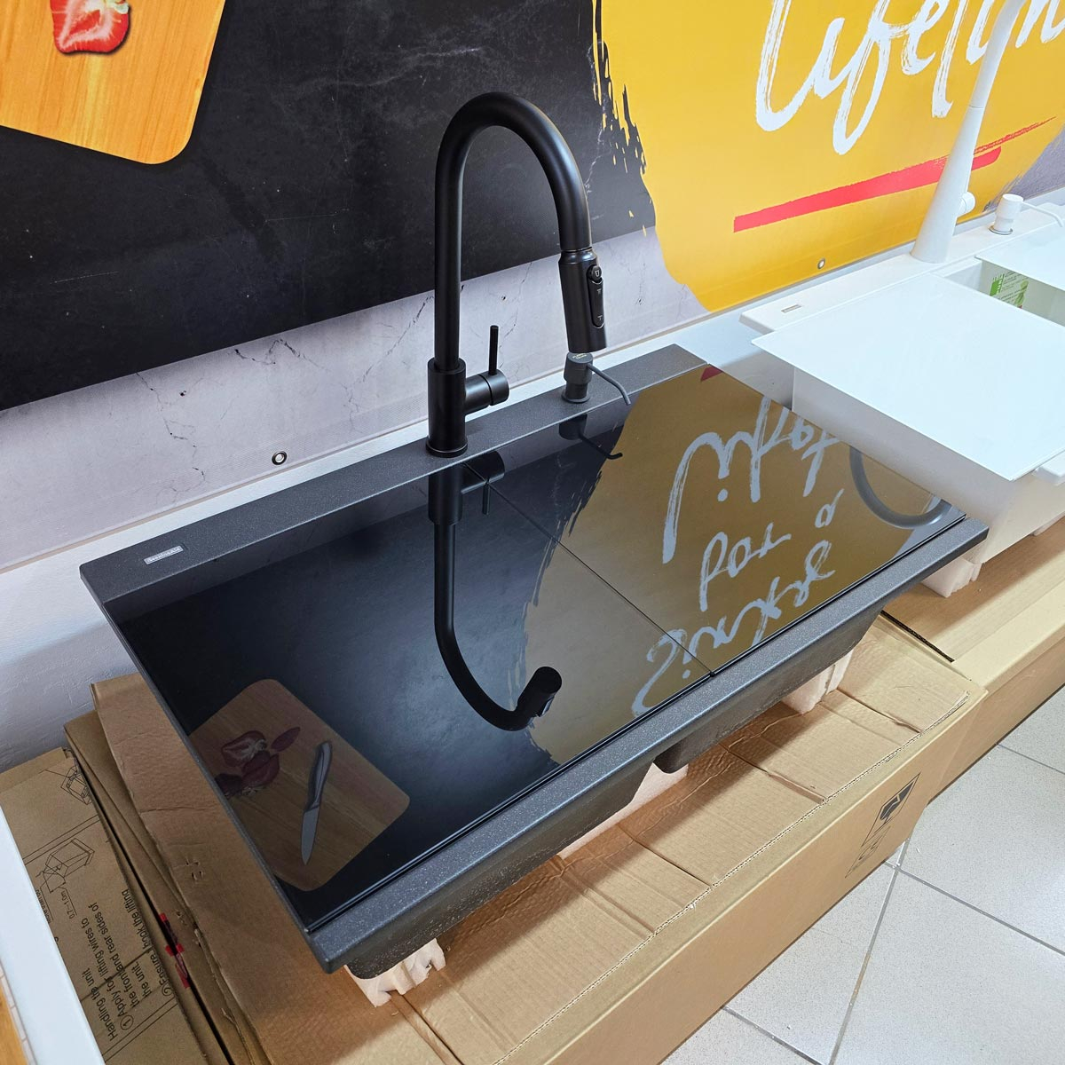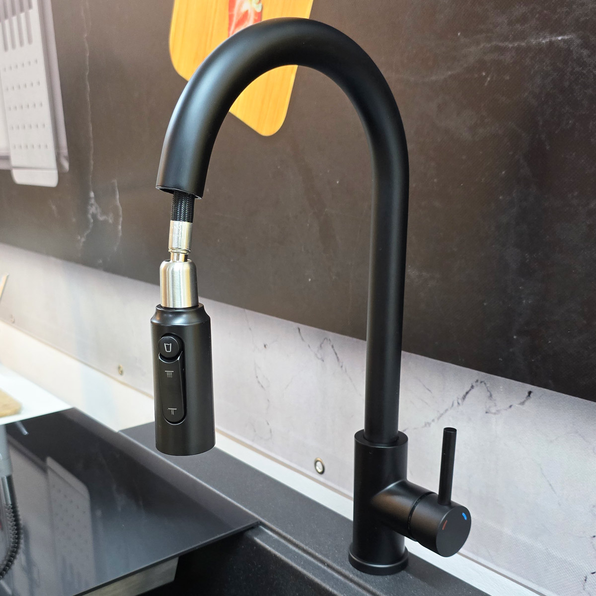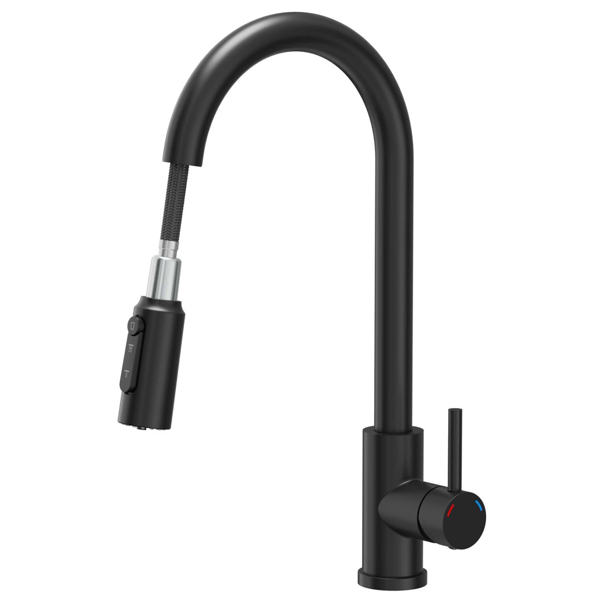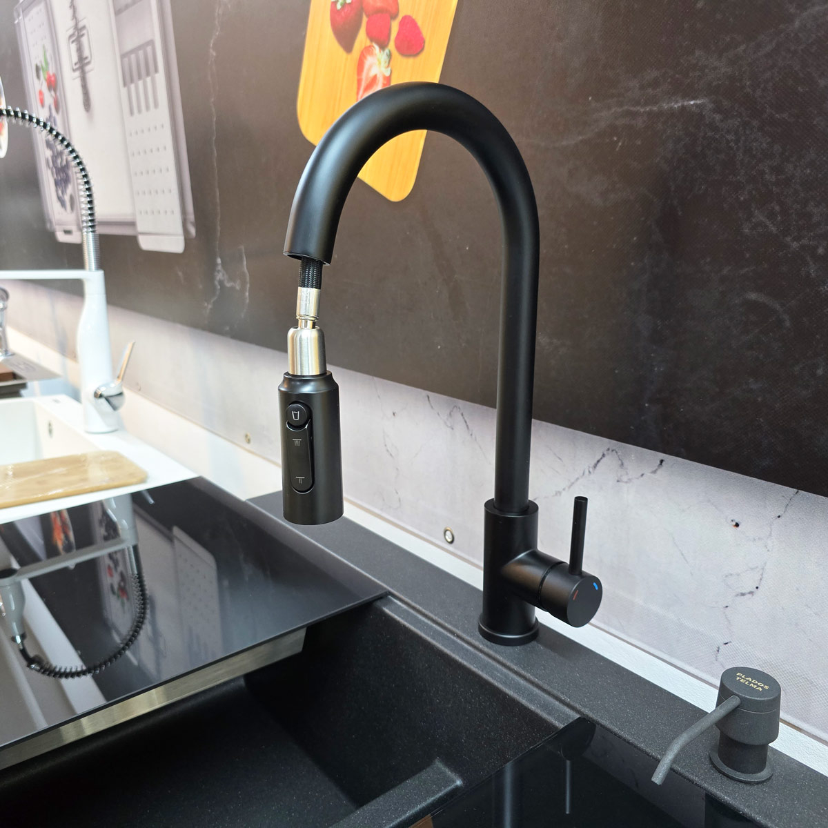 Este un model din gama premium, de culoare negru mat si perlator extractibil/detasabil, monocomanda + buton perlator pornire/oprire apa filtrata. Manerul monocomanda actioneaza apa rece si apa calda iar butonul situat pe perlator controleaza pornirea si oprirea apei filtrate (vezi in poze).
