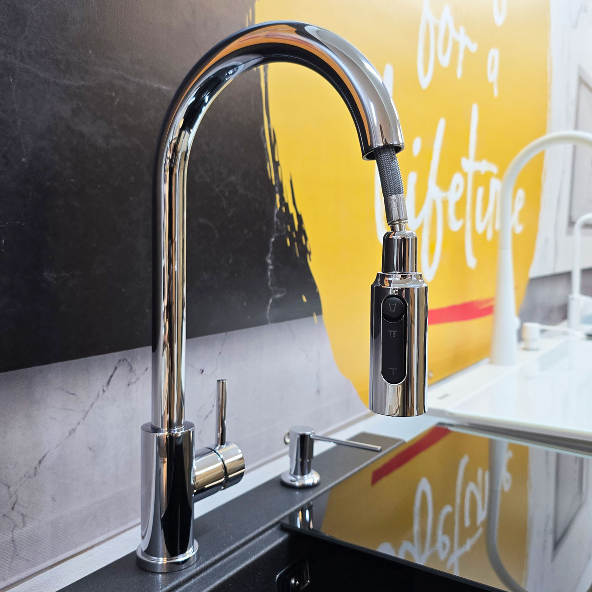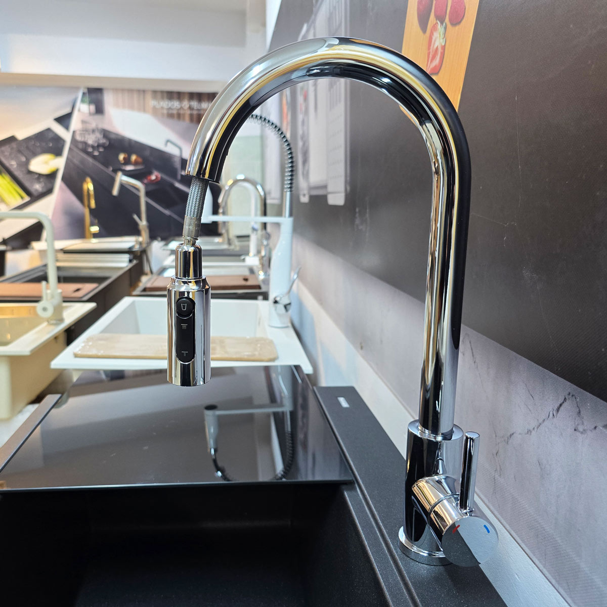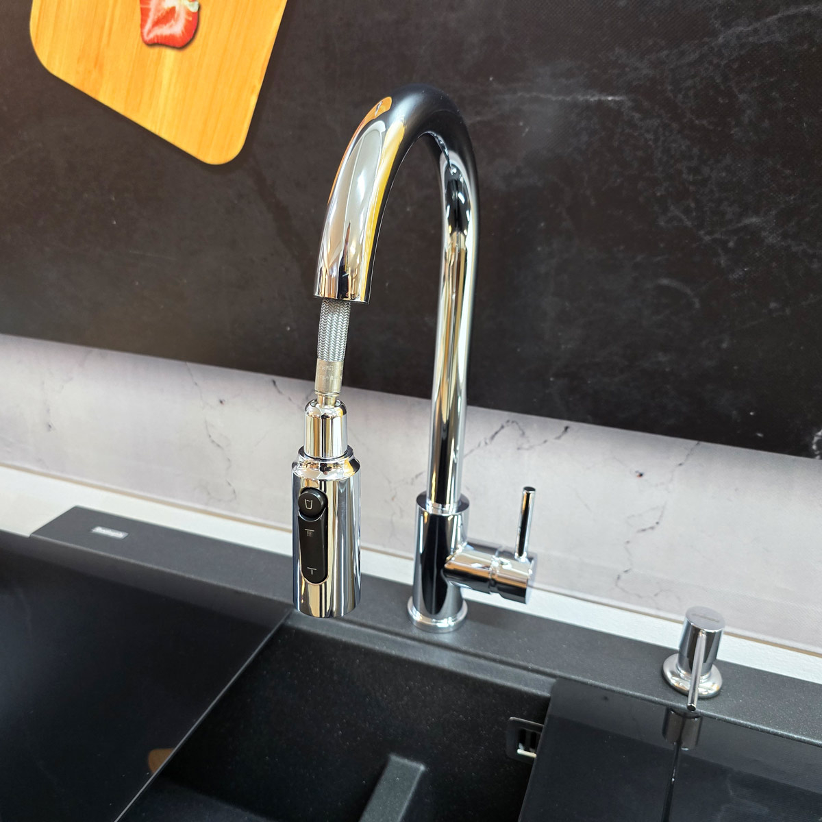 Este un model din gama premium, cu finisaj cromat si perlator extractibil/detasabil, monocomanda + buton perlator pornire/oprire apa filtrata. Manerul monocomanda actioneaza apa rece si apa calda iar butonul situat pe perlator controleaza pornirea si oprirea apei filtrate (vezi in poze).