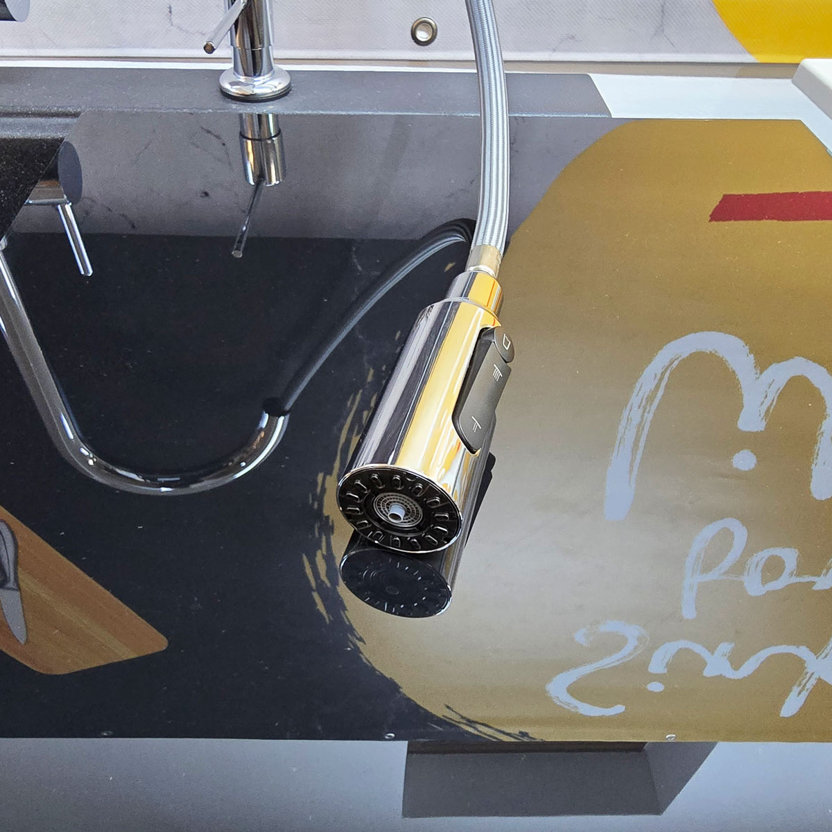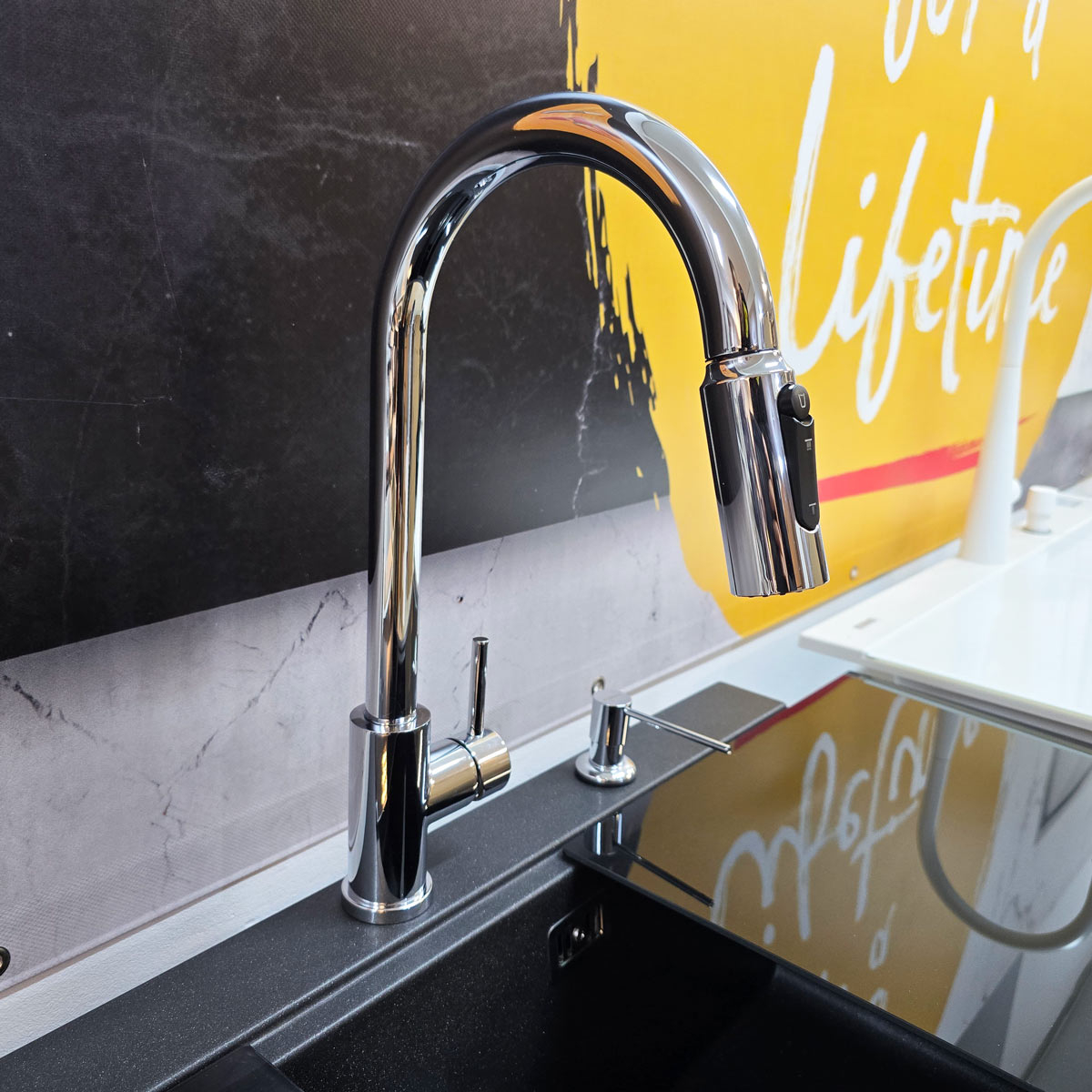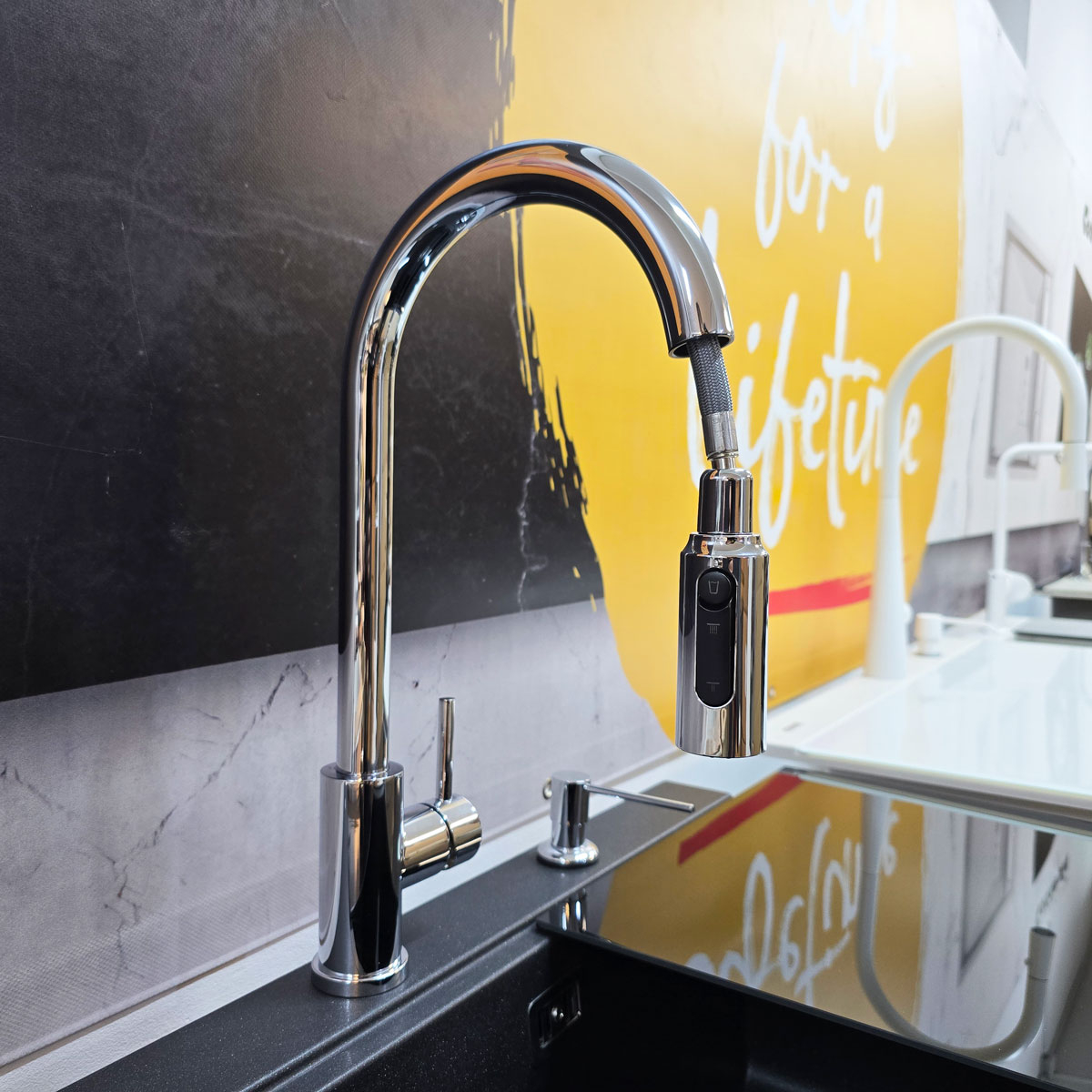 Este un model din gama premium, cu finisaj cromat si perlator extractibil/detasabil, monocomanda + buton perlator pornire/oprire apa filtrata. Manerul monocomanda actioneaza apa rece si apa calda iar butonul situat pe perlator controleaza pornirea si oprirea apei filtrate (vezi in poze).