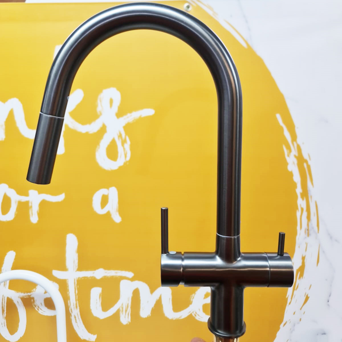 Bateria de chiuveta CookingAid Three Flow Gun Metal este o baterie bicomanda premium cu 3 cai de o calitate exceptionala, rotativa si cu perlator extractibil, care furnizeaza atat apa calda si rece cat si apa dintr-un filtru de apa gen Kangen, Brita, H2O sau altele.