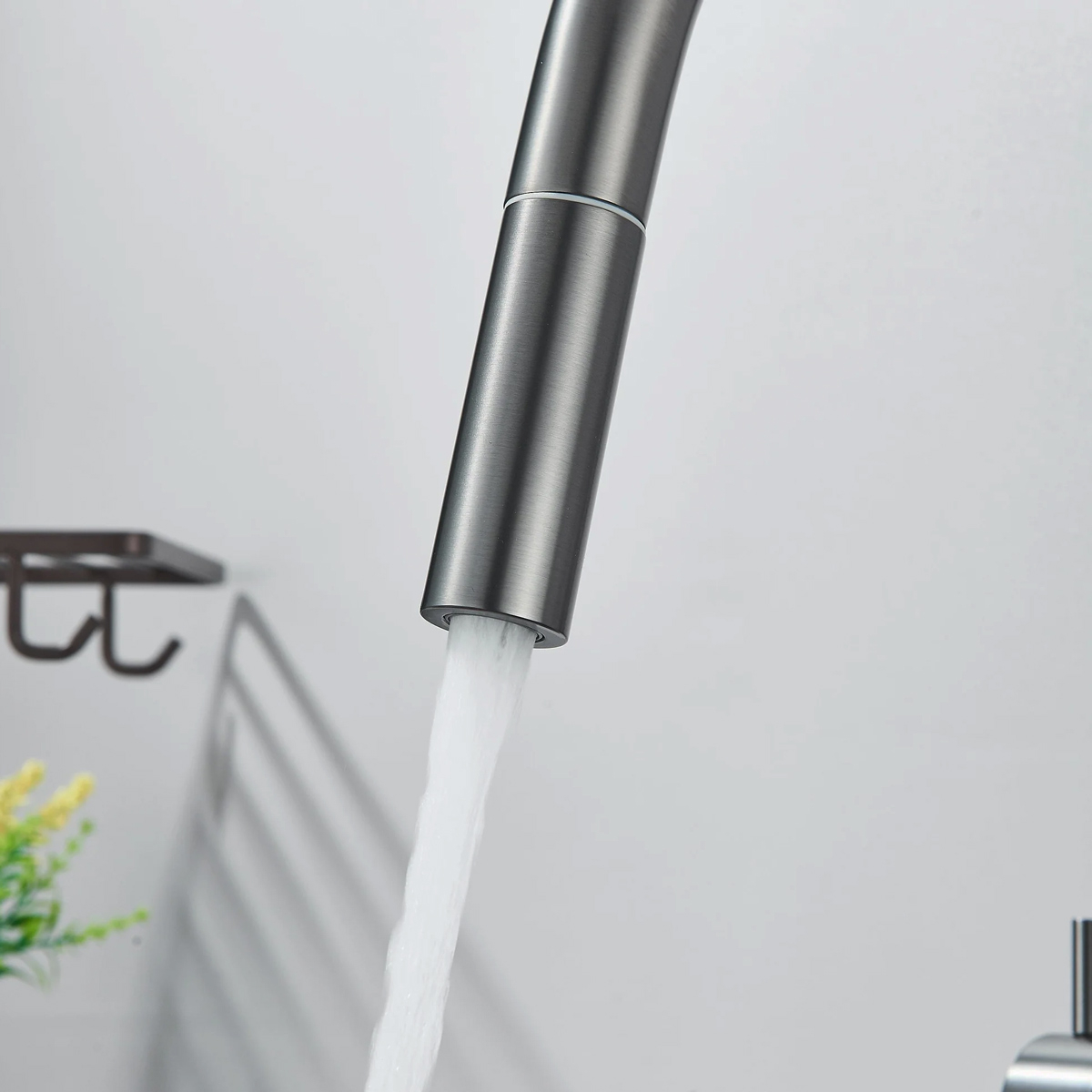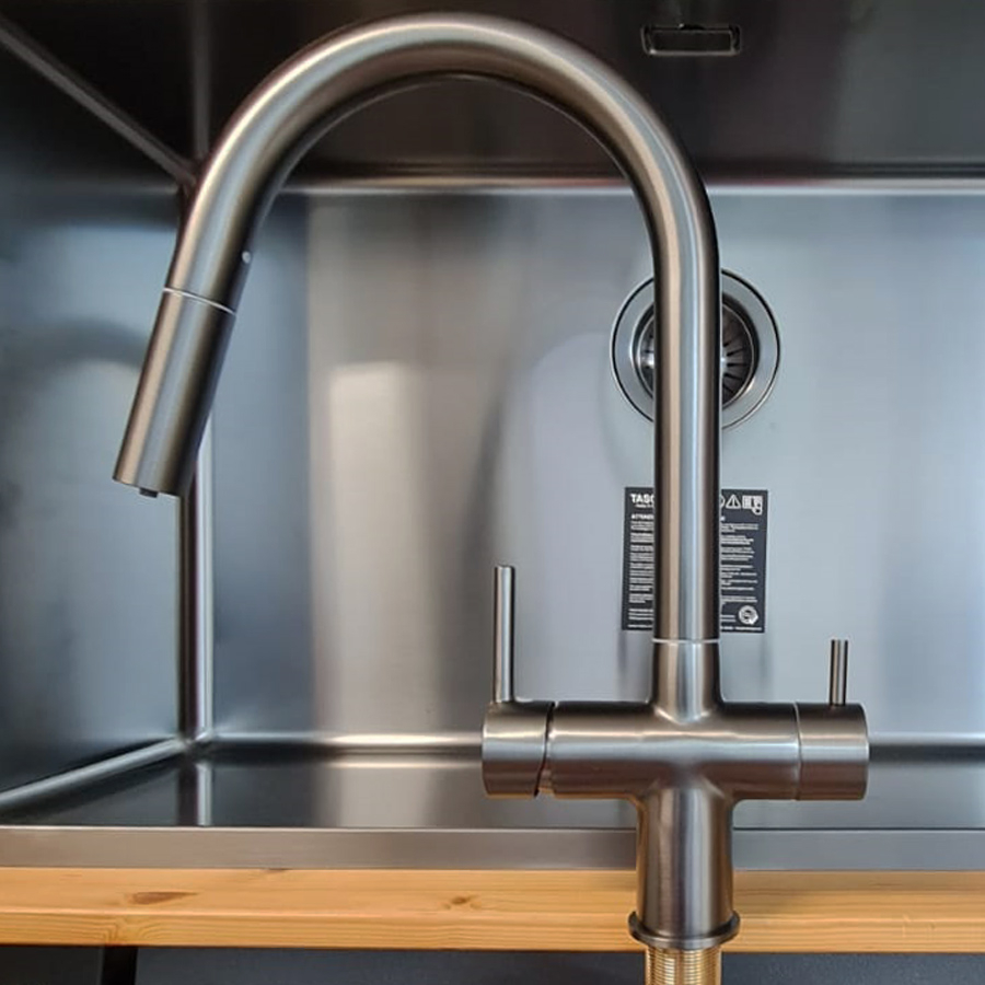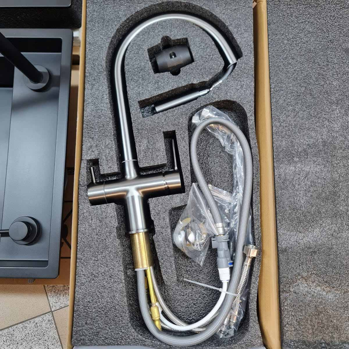 Este un model din gama premium, cu finisaj inox gri metalic periat si perlator extractibil/detasabil, cu 2 manere de pornire a apei, unul pentru clasica apa rece si apa calda iar cel de al doilea maner este pentru pornirea si oprirea apei filtrate (vezi in poze). Bateria are in varful perlatorului detasabil un stut special prin care este furnizata apa filtrata, comandata de manerul mic, care asa cum se vede in poze, se poate dispune pe stanga sau pe dreapta.