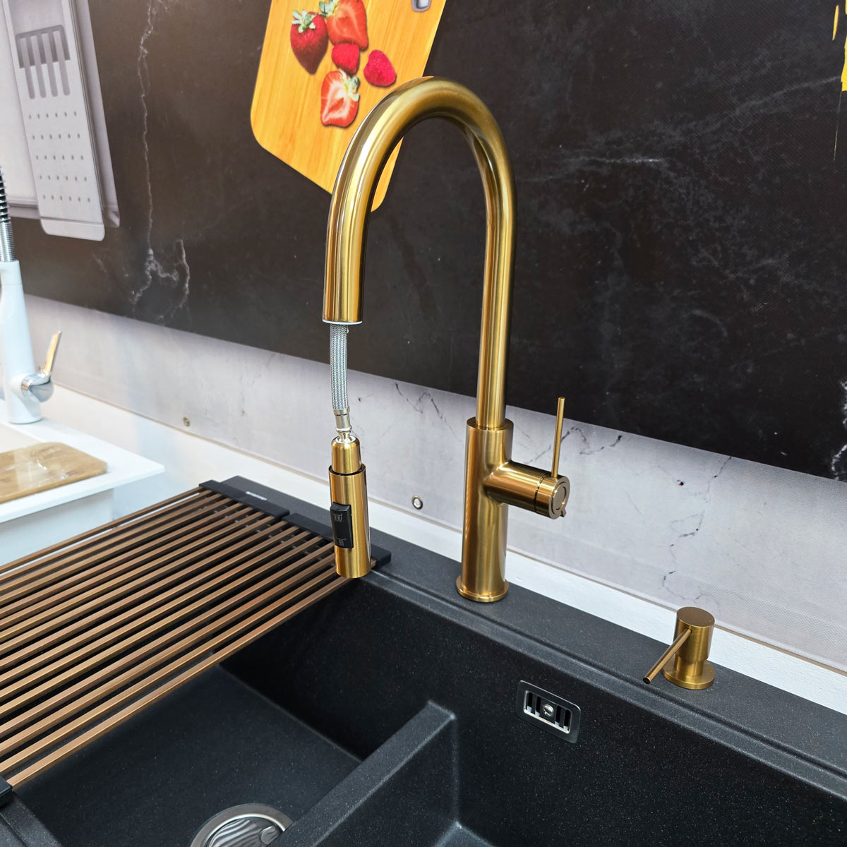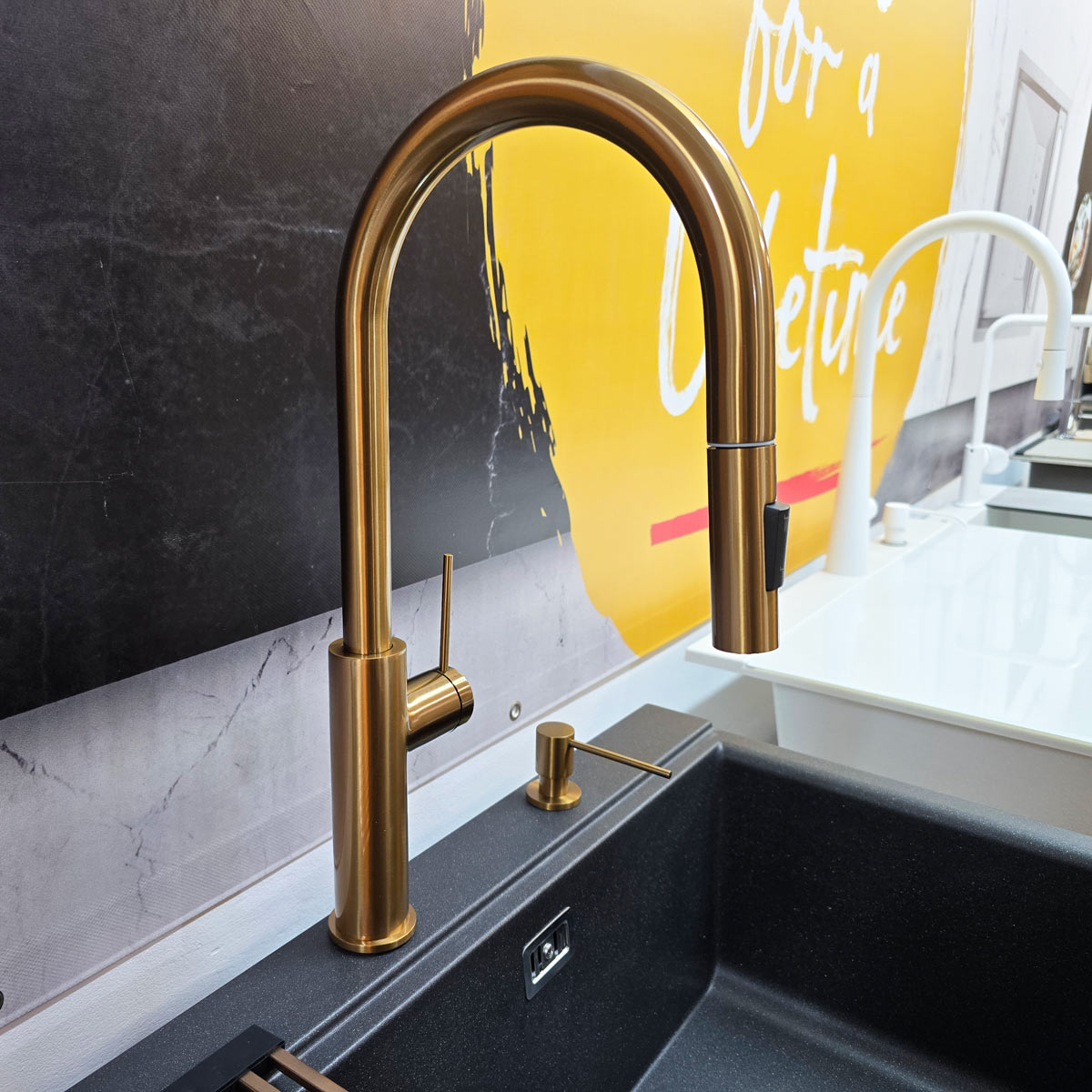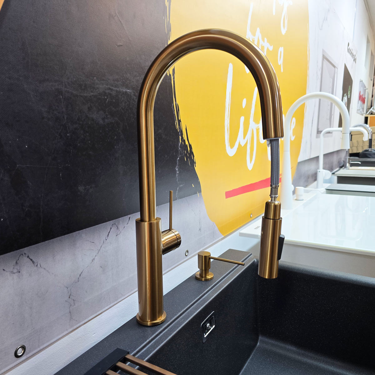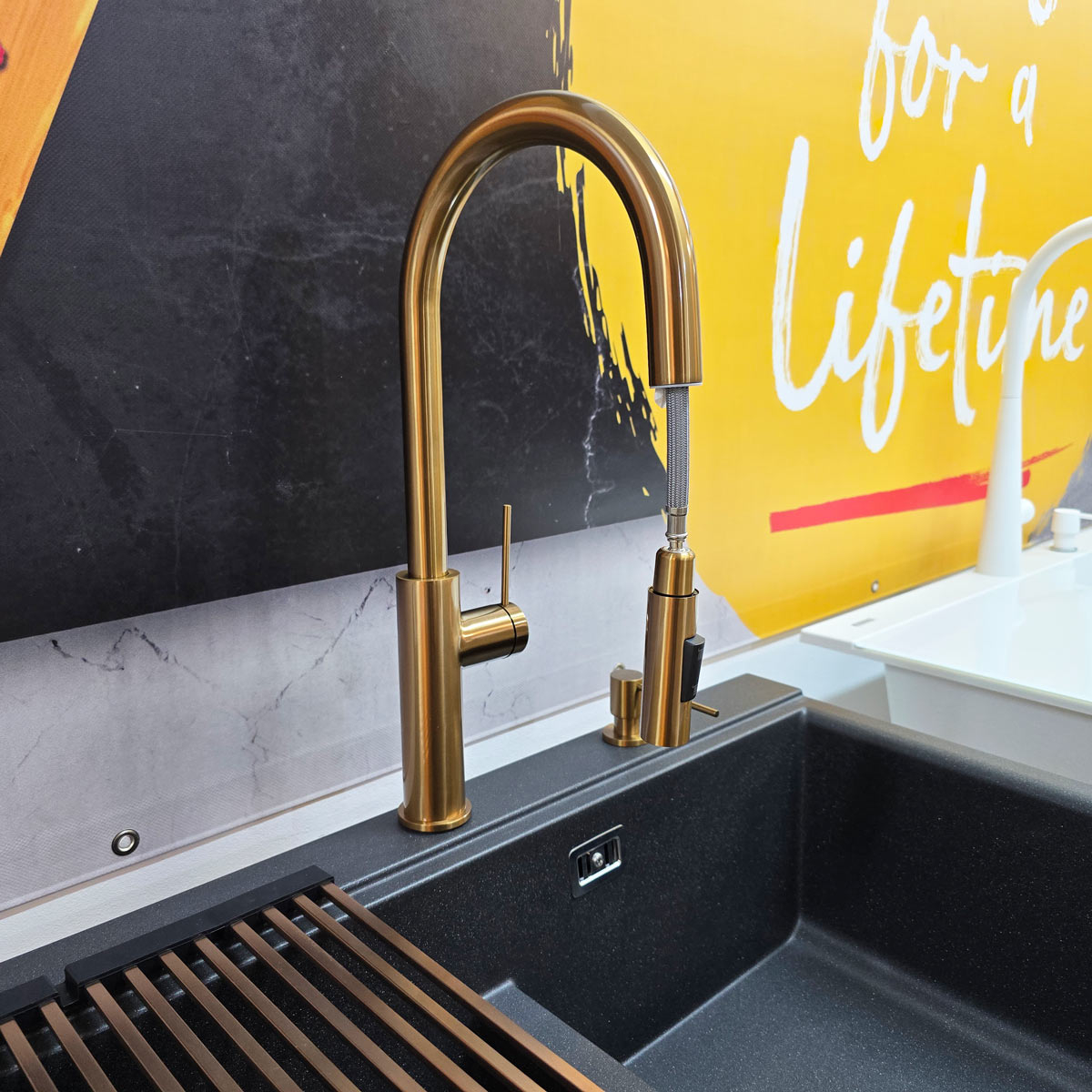 Bateria de chiuveta CookingAid Jennifer Copper este o baterie de bucatarie profesionala de culoarea inoxului periat, din seria Elite CookingAid, confectionata din otel inoxidabil SUS304-10/18 cu strat aplicat de PVD de culoarea cuprului si este prevazuta cu furtun dus extractibil si cap perlator cu buton de schimbare de pe dus/spray pe jet central adunat.