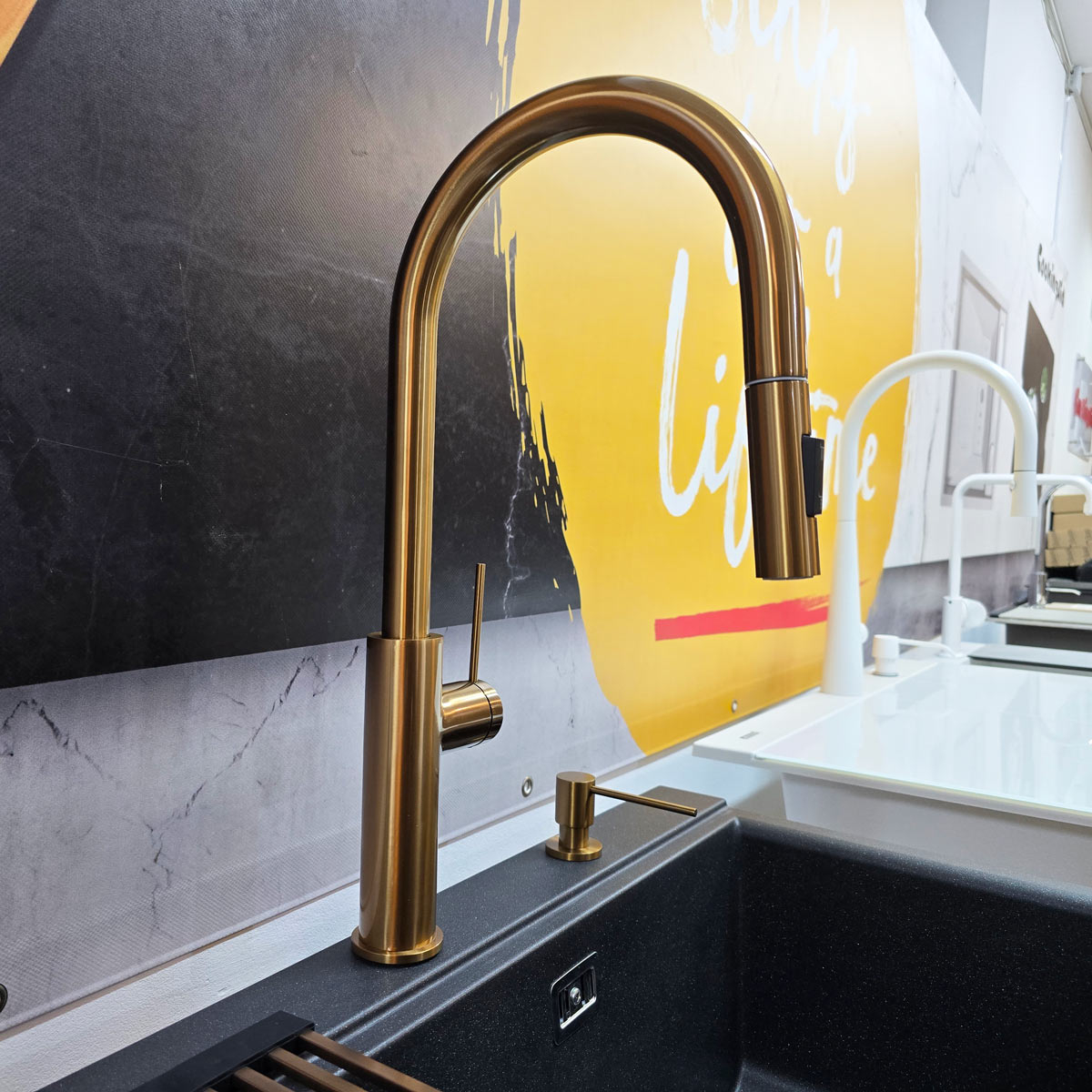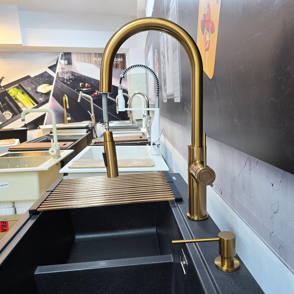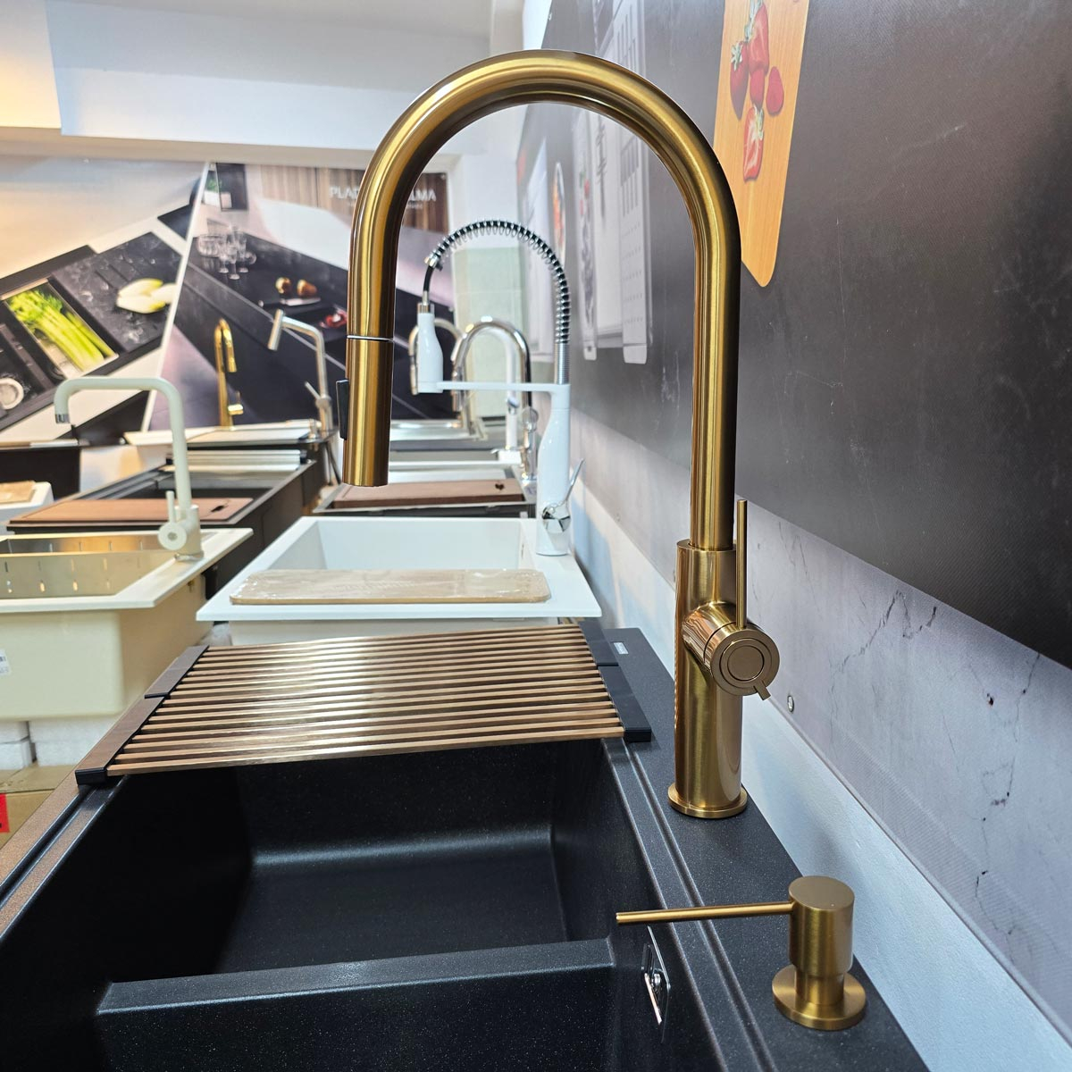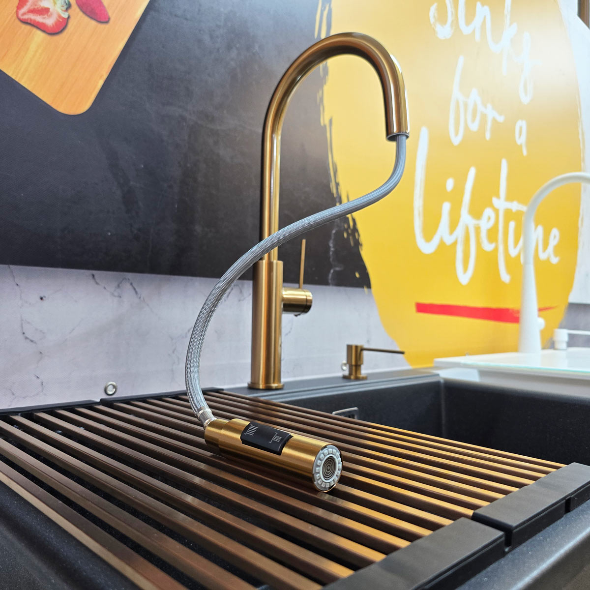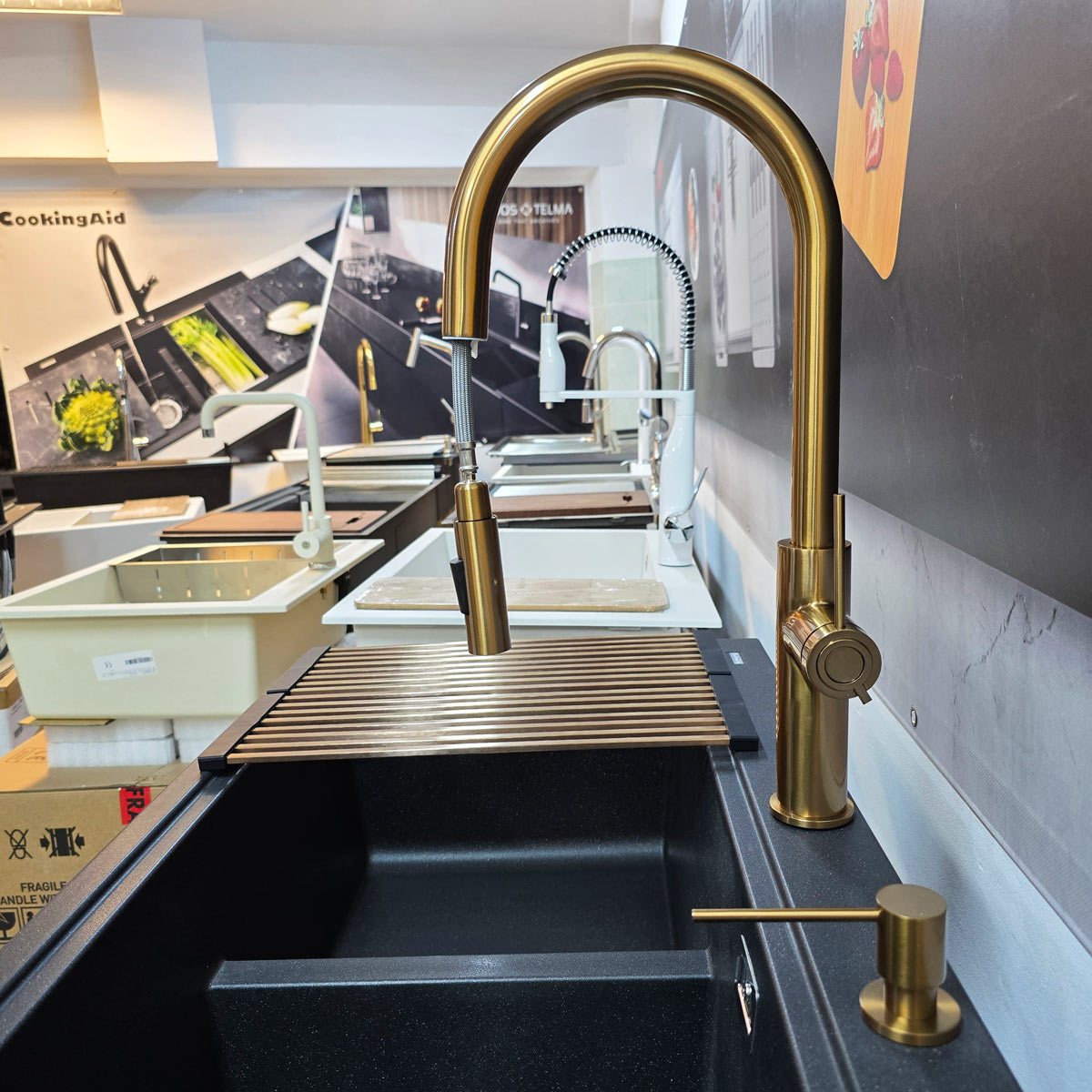 Bateria de chiuveta CookingAid Jennifer Copper este o baterie de bucatarie profesionala de culoarea inoxului periat, din seria Elite CookingAid, confectionata din otel inoxidabil SUS304-10/18 cu strat aplicat de PVD de culoarea cuprului si este prevazuta cu furtun dus extractibil si cap perlator cu buton de schimbare de pe dus/spray pe jet central adunat.