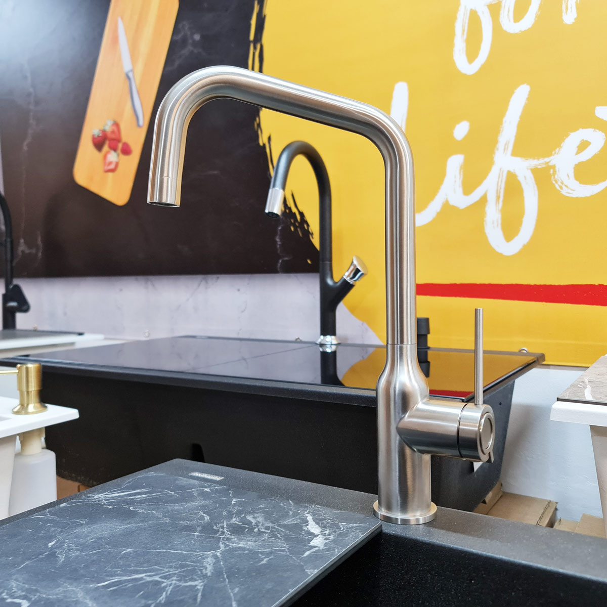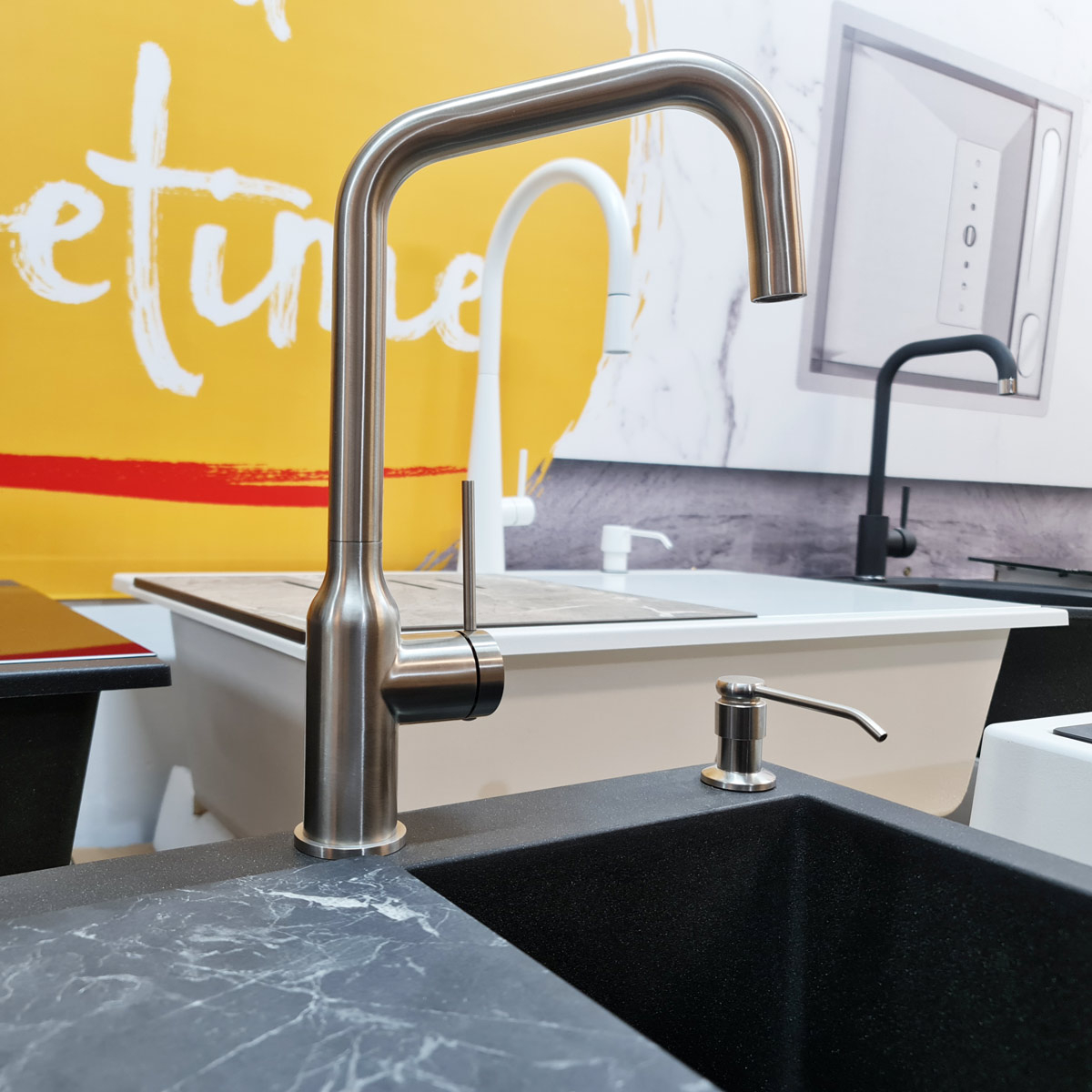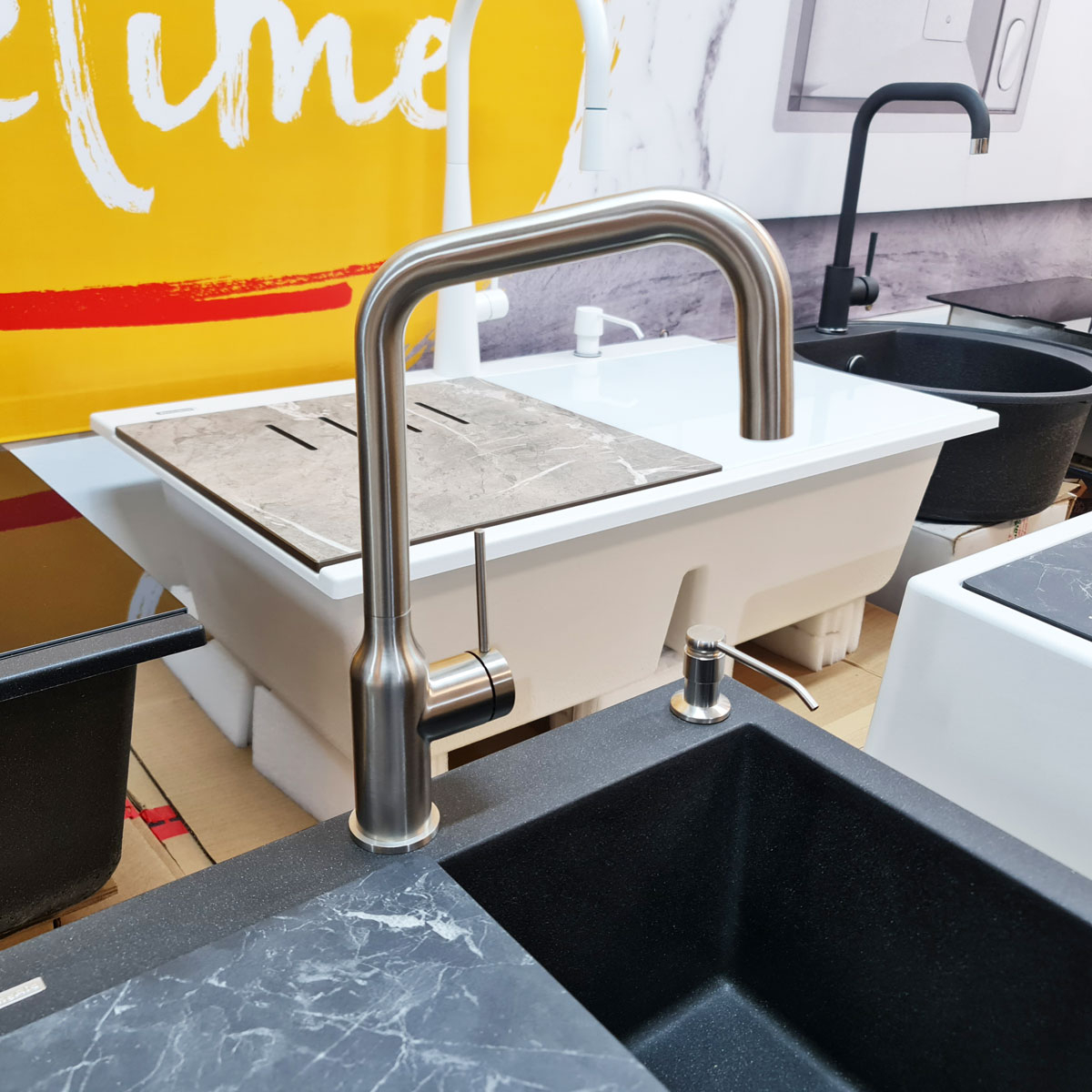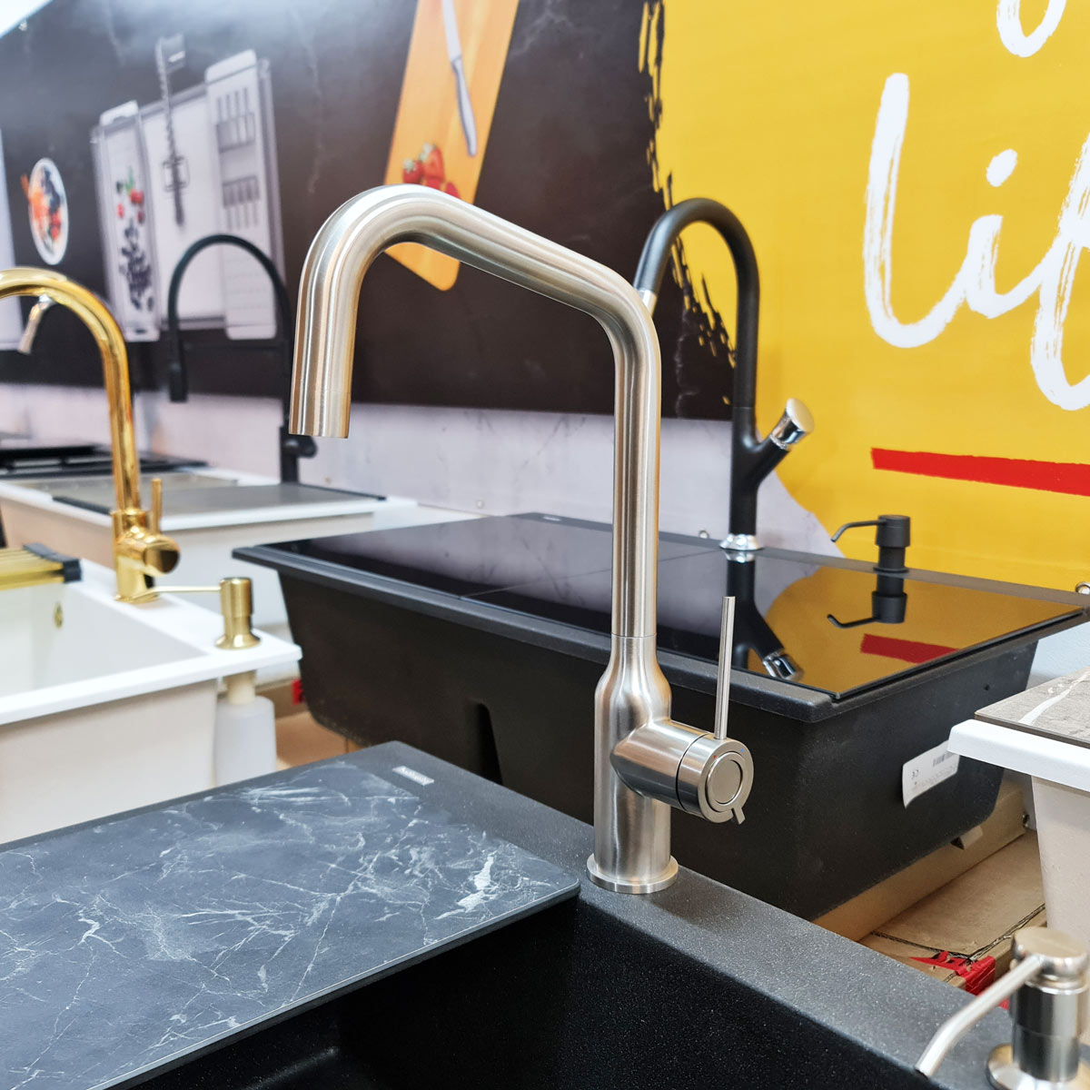 Accesoriile pentru instalare, cum sunt sistemul de fixare pe chiuveta sau pe blat si furtunurile de alimentare sunt incluse.