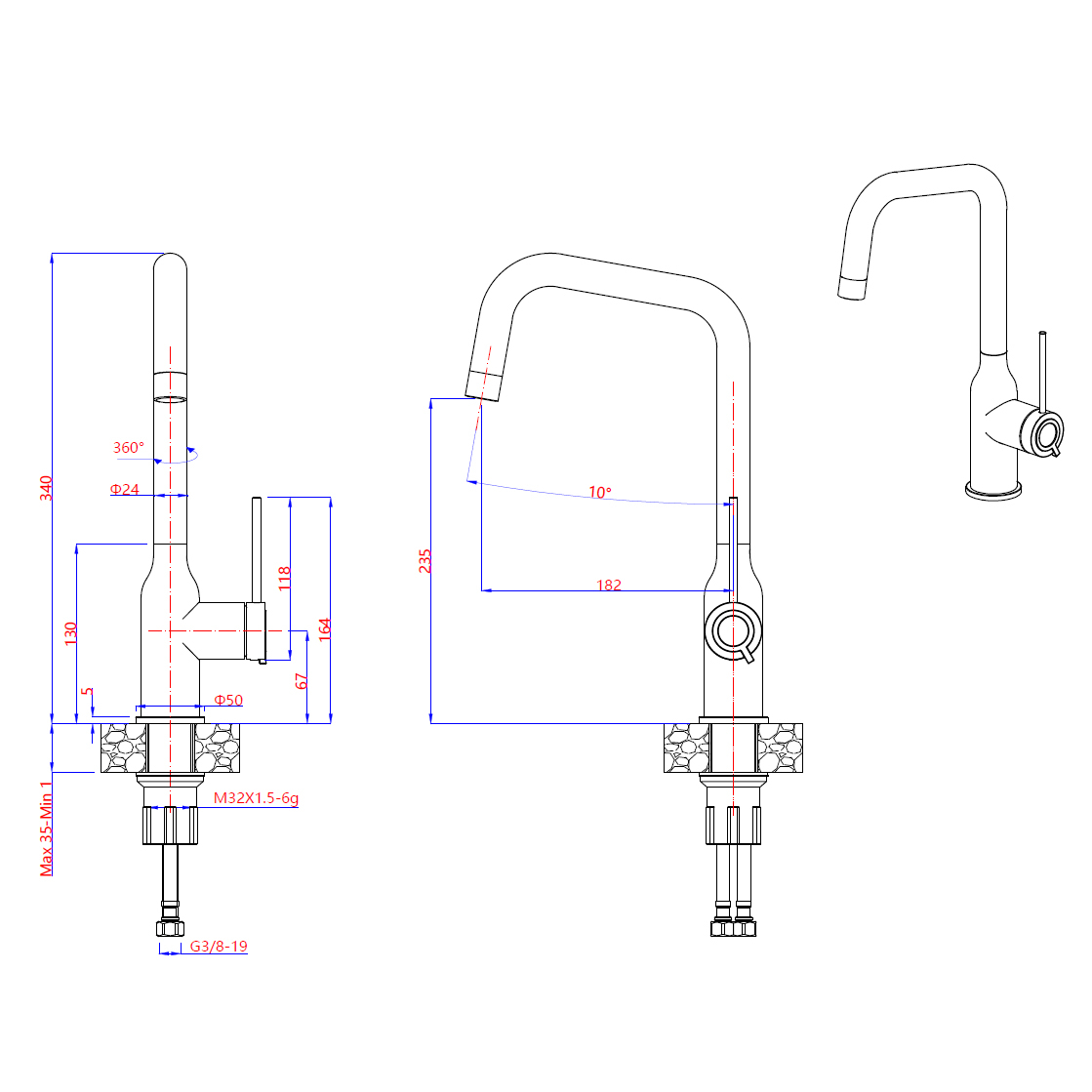 Gaura necesara pentru montaj pe chiuveta sau pe blat: 35mm