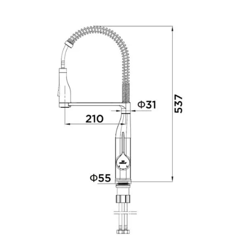 Bateria este confectionata din alama cromata de cea mai buna calitate si este prevazuta cu corp otelos flexibil iar perlatorul este detasabil din suportul sau de pe baterie. Jetul de apa este interschimbabil intre jet centrat adunat si jet larg tip dus, la buton.
