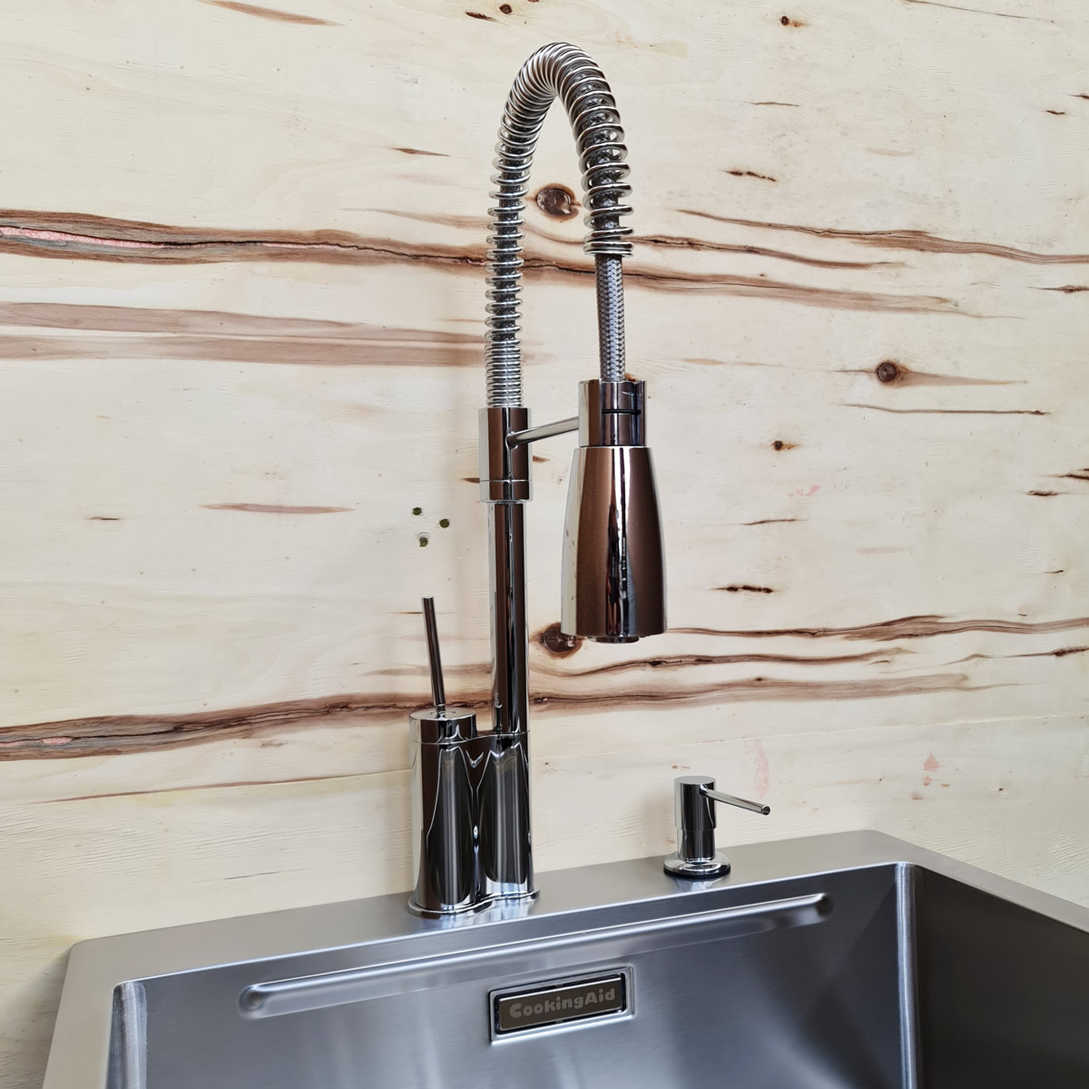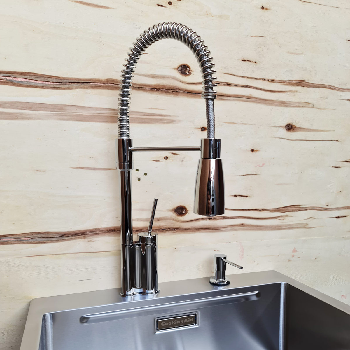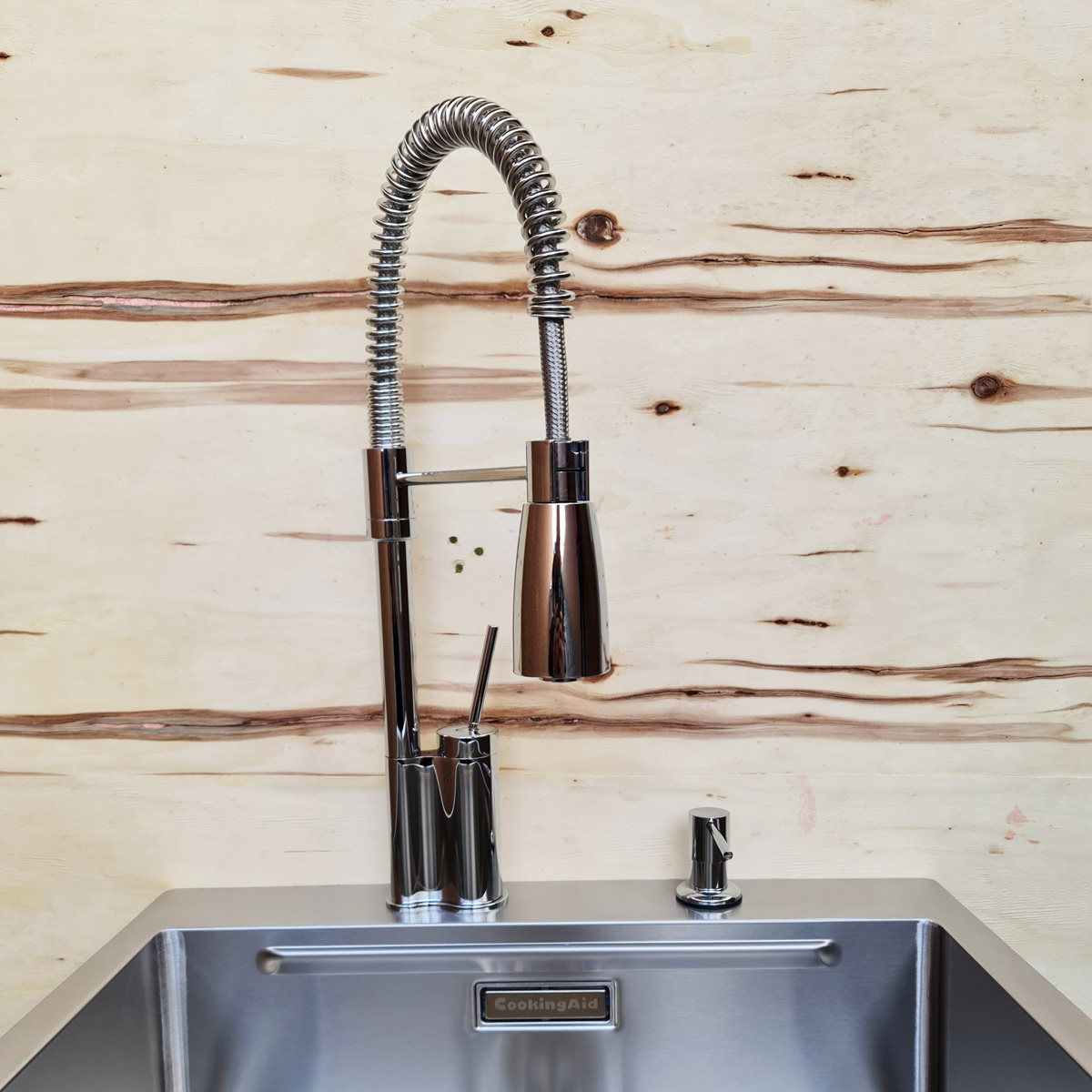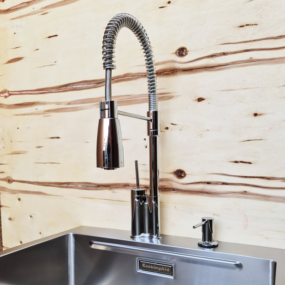 Bateria de chiuveta CookingAid SPRING CHROME 40 este o baterie de bucatarie profesionala din gama premium CookingAid, confectionata din alama cromata de cea mai buna calitate si este prevazuta cu cap flexibil detasabil + buton interschimbabil jet/dus.