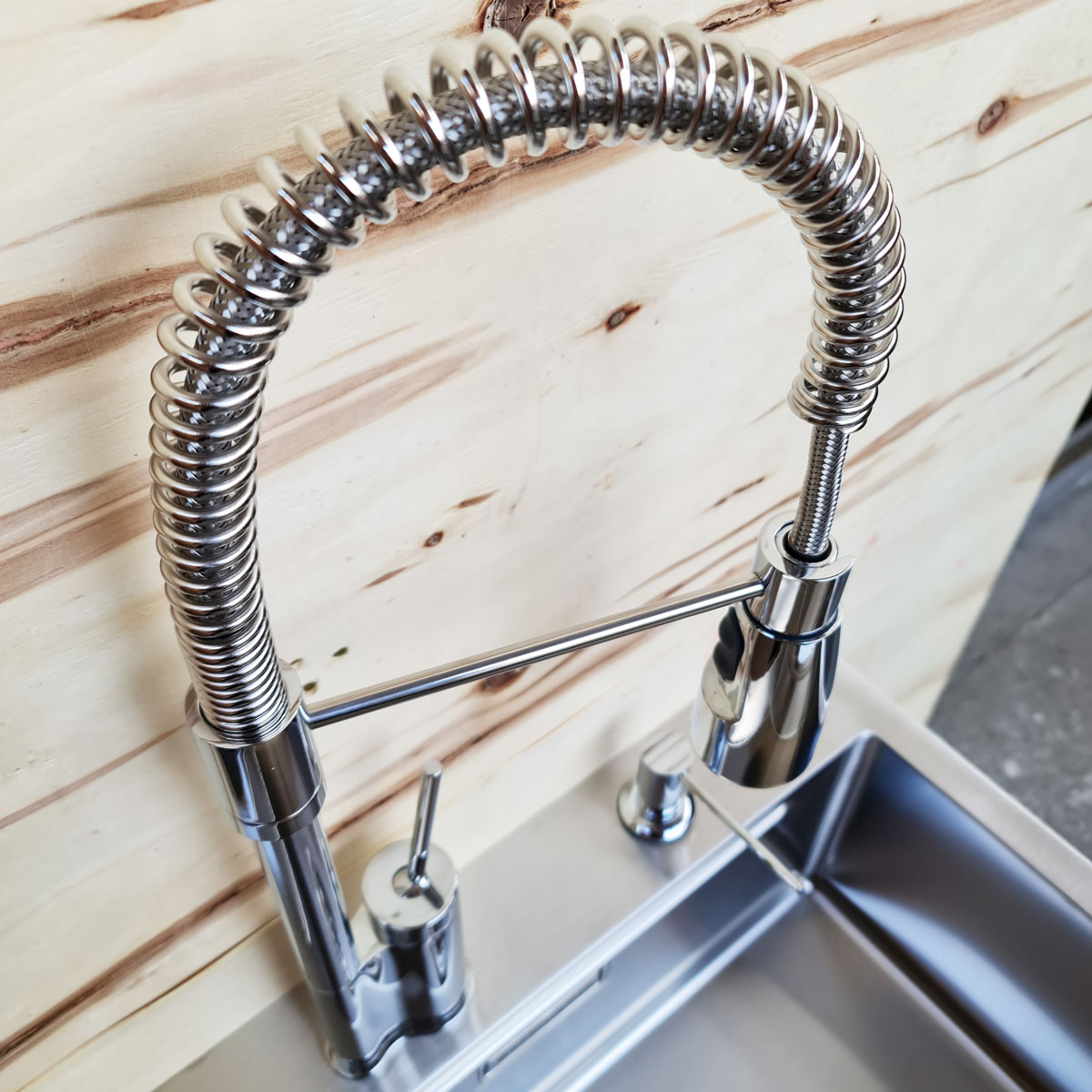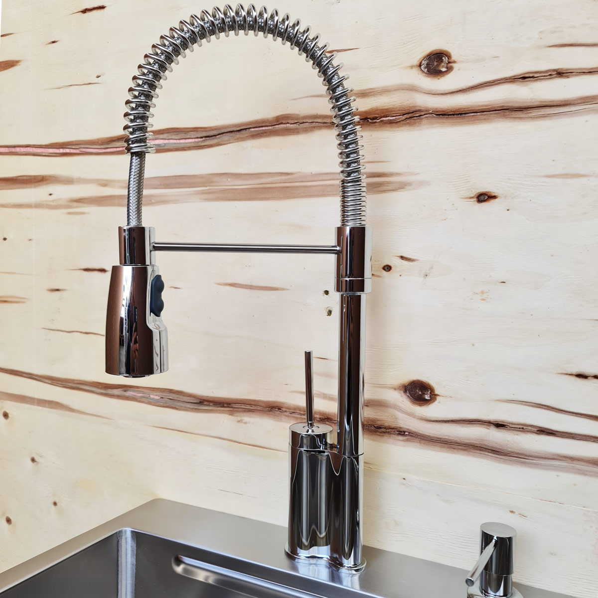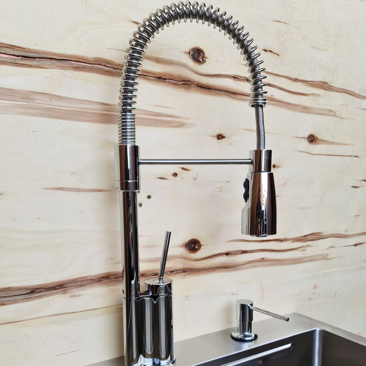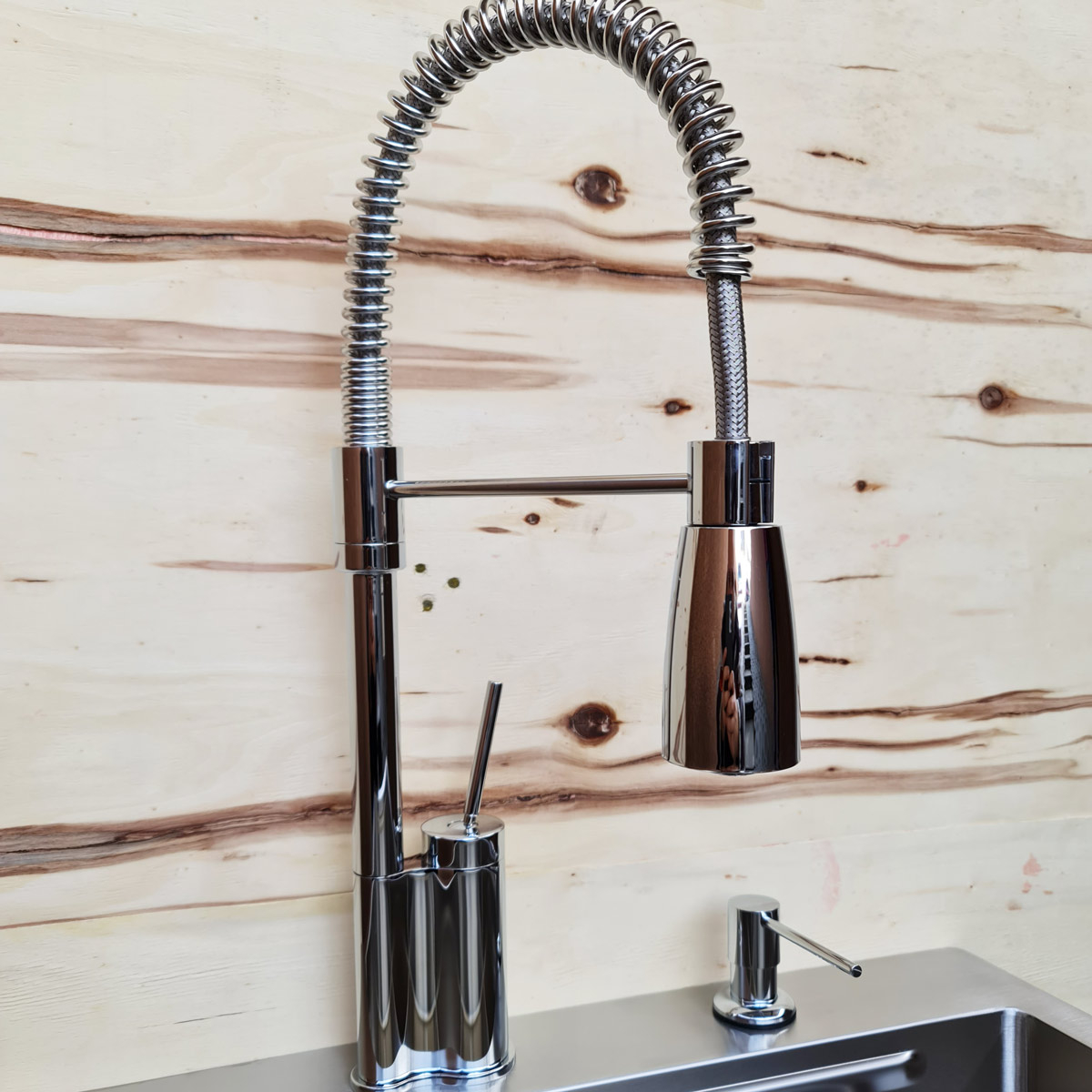Bateria de chiuveta CookingAid SPRING CHROME 40 este o baterie de bucatarie profesionala din gama premium CookingAid, confectionata din alama cromata de cea mai buna calitate si este prevazuta cu cap flexibil detasabil + buton interschimbabil jet/dus.