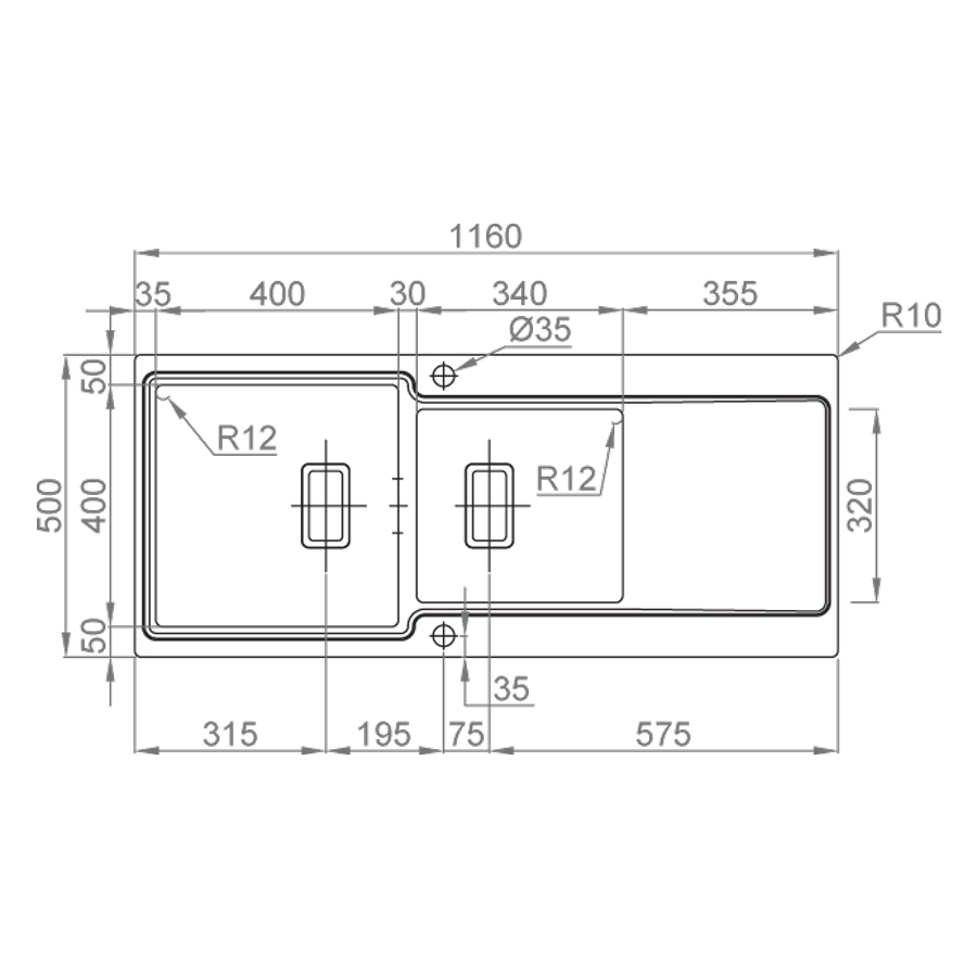 Dimensiunea exterioara a chiuvetei este de 1160mm lungime / 500mm latime / 200mm inaltime.
