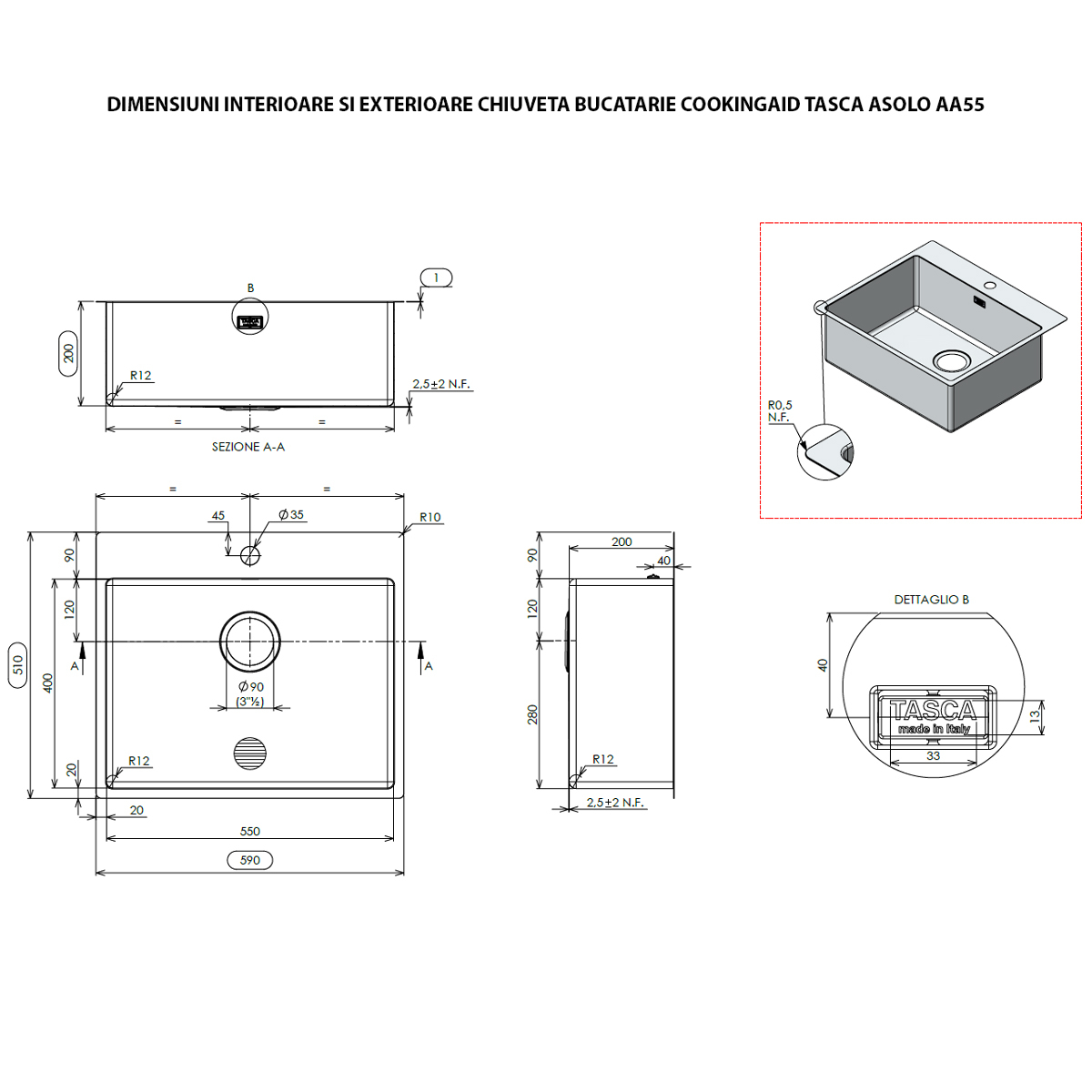 Chiuveta Tasca Asolo AA55 cu un aer minimalist, este sudata din otel inoxidabil periat 18/10 cu raze de curbura la colturile interioare ale cuvei R12 (de 12mm) si se poate monta aproape invizibil pe blat pentru orice tip de blat sau optional, intr-un mic sanfren la nivelul blatului, pentru blaturi din materiale rezistente la apa (granit, compozit, quartz, quartzit, marmura, travertin, HPL sau HPC), chiuveta avand o buza superioara plana, fara tesituri sau alte indoiri.